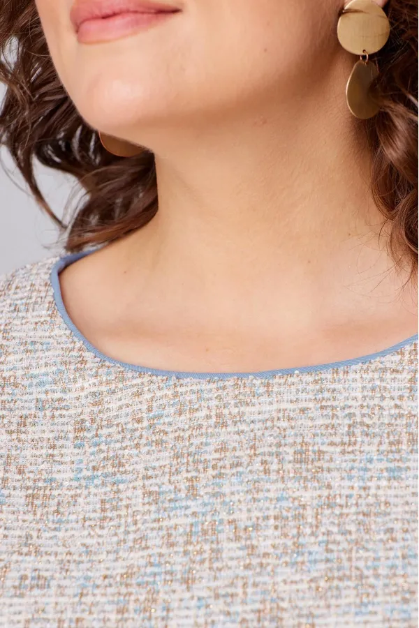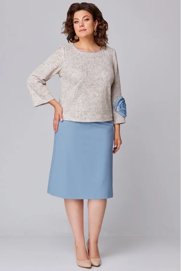 Комплект женский, двухпредметный, состоящий из туники и юбки. Блузка прямого силуэта из трикотажного полотна «шанель», с нагрудными вытачками из бокового шва. Рукав втачной одношовный, расширенный к низу. По левому рукав... Читать далее...