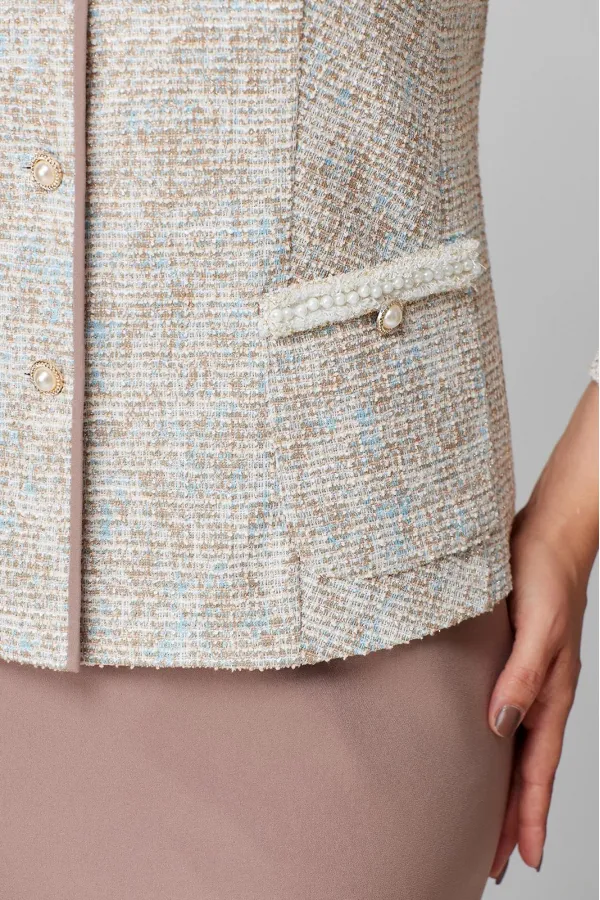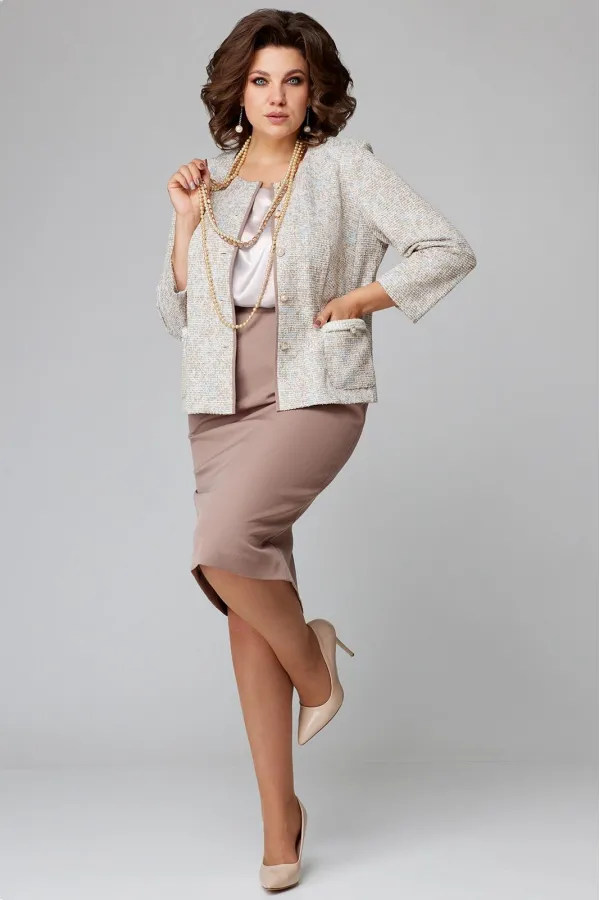 Элегантный и стильный комплект состоящий из жакета и юбки. Жакет слегка приталенного силуэта горловиной круглой формы и с застежкой на 5 петель и пуговиц. По переду жакета накладные карманы с декоративной тесьмой и пугов... Читать далее...