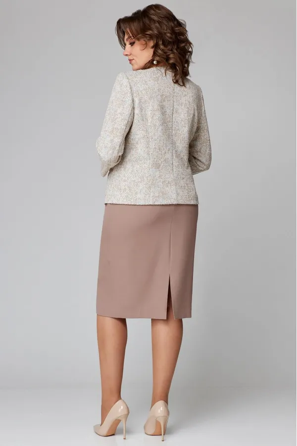 Элегантный и стильный комплект состоящий из жакета и юбки. Жакет слегка приталенного силуэта горловиной круглой формы и с застежкой на 5 петель и пуговиц. По переду жакета накладные карманы с декоративной тесьмой и пуговицей. По краю борта контрастная отделка в цвет юбки . Рукав втачной двухшовный. Спинка со средним швом и талиевыми вытачками. Юбка прямая, слегка зауженная к низу, на подкладке с притачным поясом, для максимального комфорта в поясе по бокам предусмотрена резинка. По спинке в среднем шве разрез и застёжка на молнию. Длина жакета 58 см, длина рукава 54 см, длина юбки 68 см