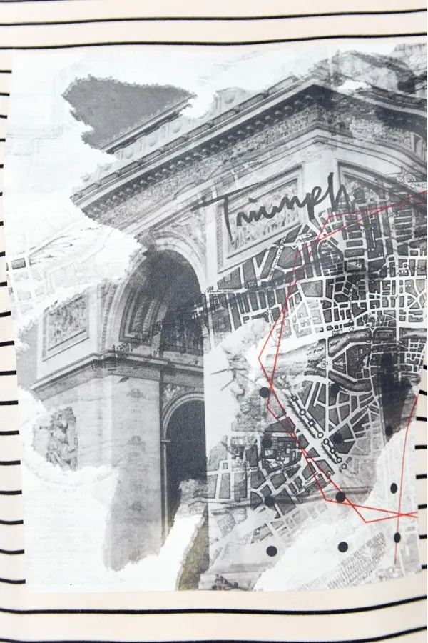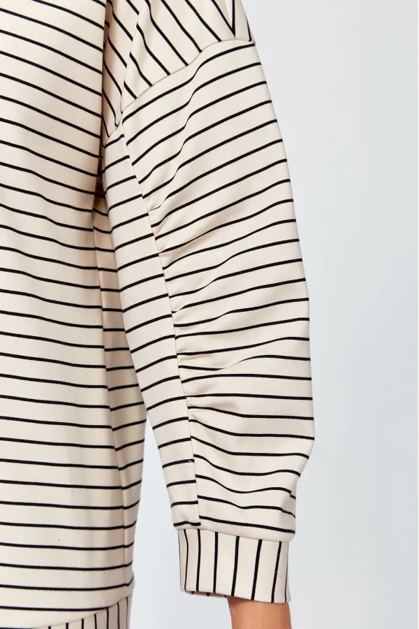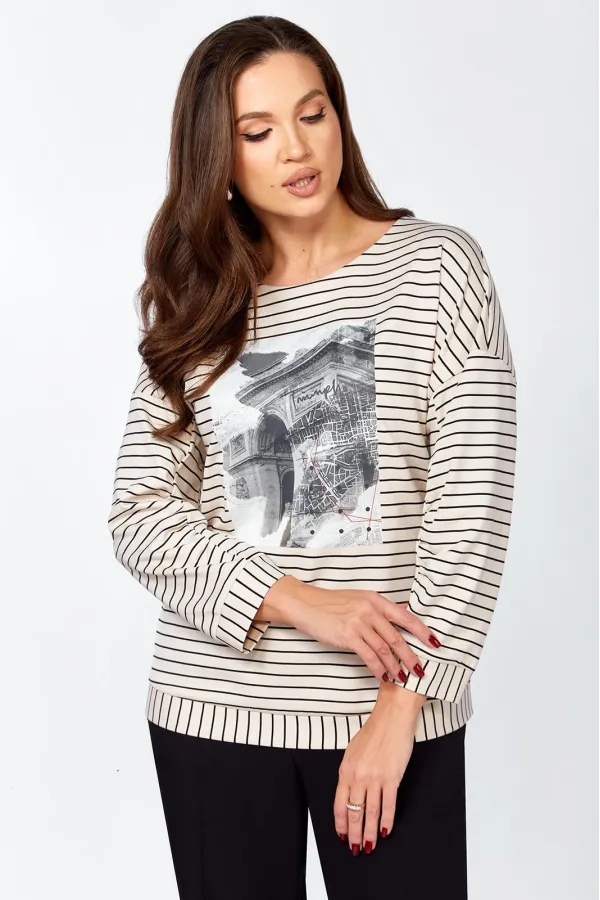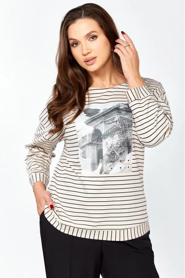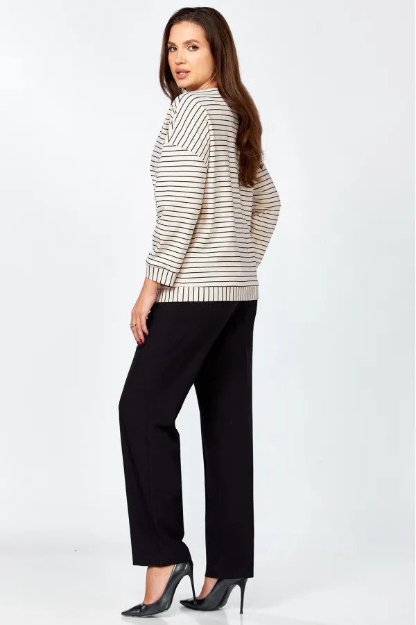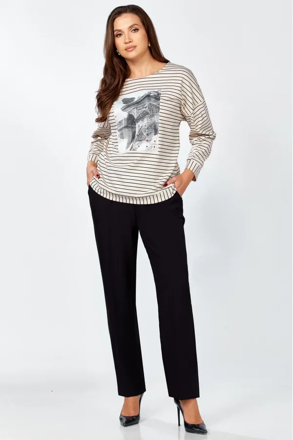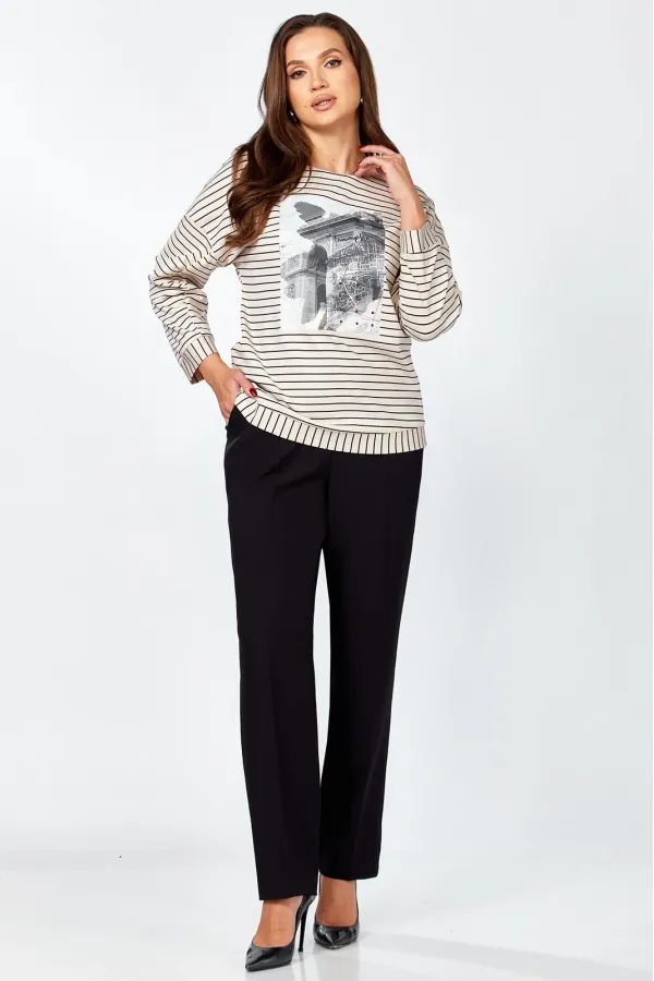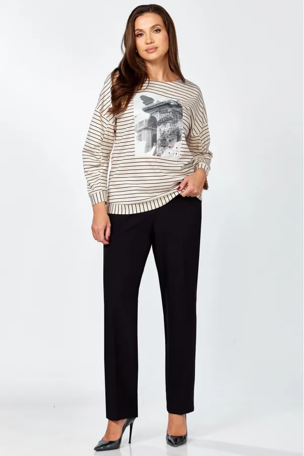 Комплект женский , двух предметный состоящий из туники и брюки. Туника прямого силуэта выполнена из трикотажного полотна « в полоску» . Горловина переда обработана обтачкой. Линия плеча спущена . По переду авторская термопечать. Рукав втачной, двухошовный, по переднему шву рукава сборка. По низу изделия и рукава приточная манжета. Длина изделия по спинке- 63 см, длина рукава от горловины – 64 см. Брюки прямого силуэта на притачном поясе, с застежкой на тесьму- молнию и 1 пуговицу и петлю, с боковыми наклонными карманами на передних половинках брюк . По передним и задним половинкам брюк заутюжен кант. Для лучшего прилегания брюк в области талии в поясе по бокам вставлена резинка. Длина брюк по боковому шву без пояса- 102 см.