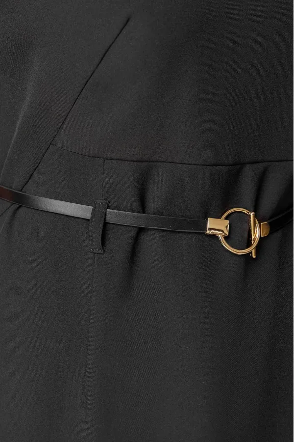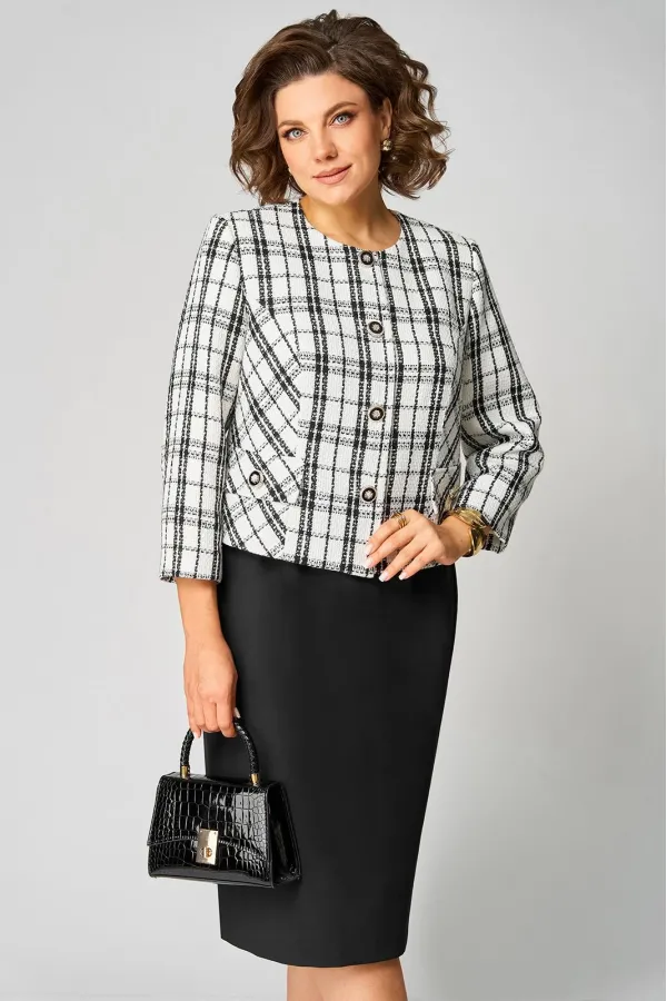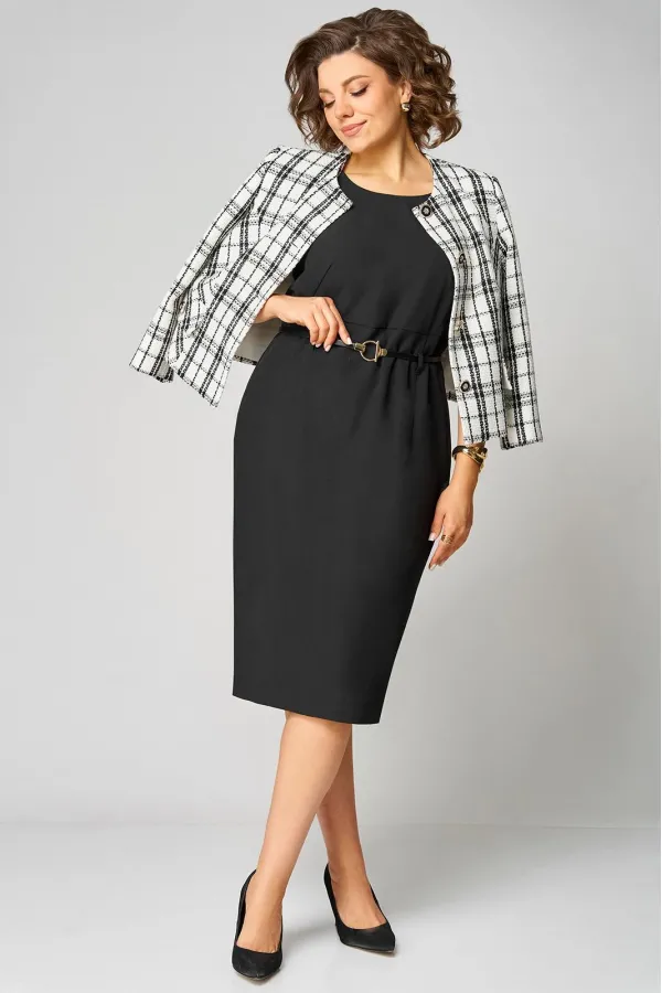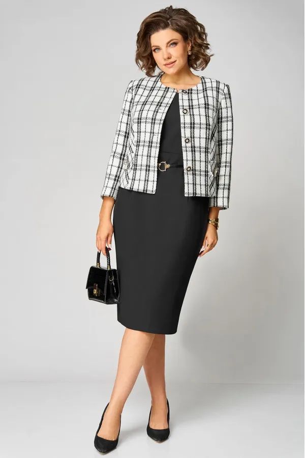 Красивый и стильный комплект в элегантном сочетании однотонного платья и жакета в клетку подойдет и для строгого образа, и для создания светлого, яркого и нежного лука с романтичными мотивами. Жакет слегка приталенного силуэта на подкладке без воротника с застежкой на 4 петли и пуговицы. По переду жакета клапаны с декоративной пуговицей. Рукав втачной двухшовный длиной 7/8. Спинка со средним швом и талевыми вытачками. Платье полуприлегающего силуэта на подкладке, слегка со спущенной линией плеча. По переду частичный подрез по талии. В среднем шве спинки потайная молния и разрез по низу. Образ дополняет ремень с оригинальной пряжкой. Длина жакета 50 см, длина рукава 51см, длина платья 106 см.