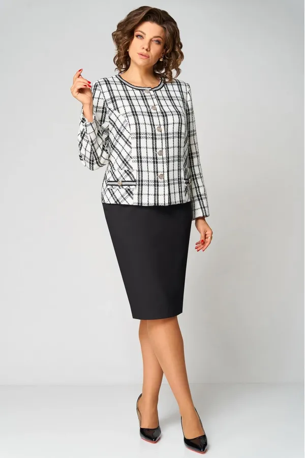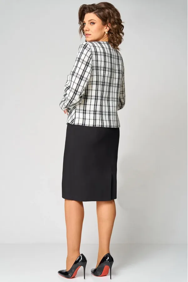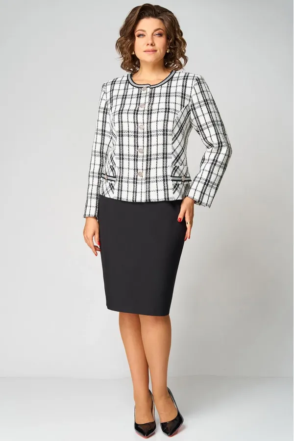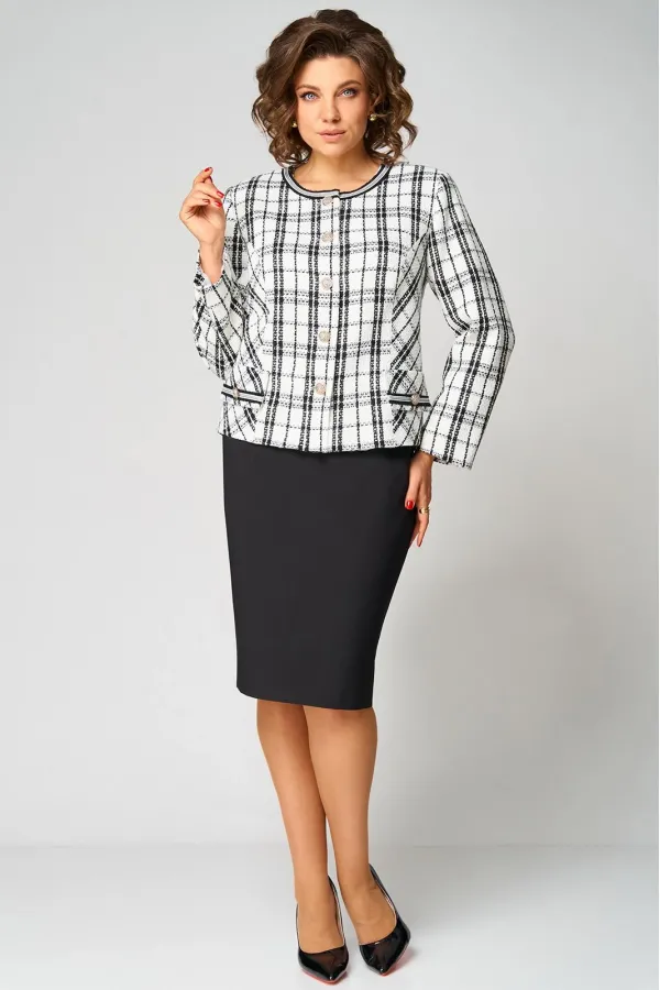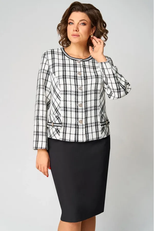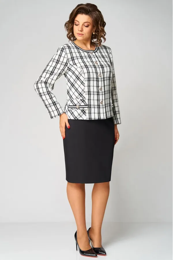 Красивый и стильный комплект в элегантном сочетании однотонной юбки и жакета. Жакет слегка приталенного силуэта на подкладке без воротника с застежкой на 5 петель и пуговиц. По переду жакета клапаны с декоративной тесьмо... Читать далее...