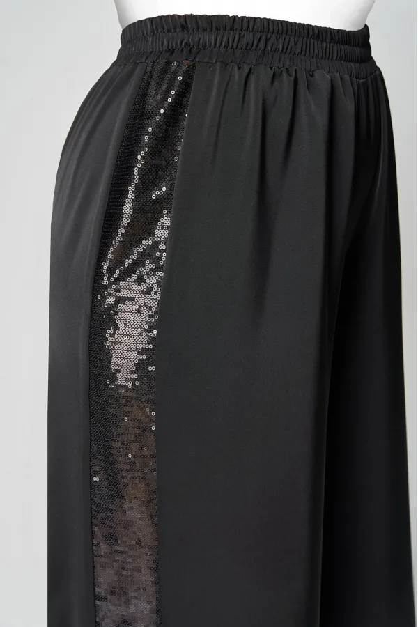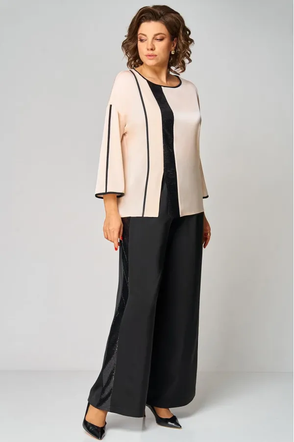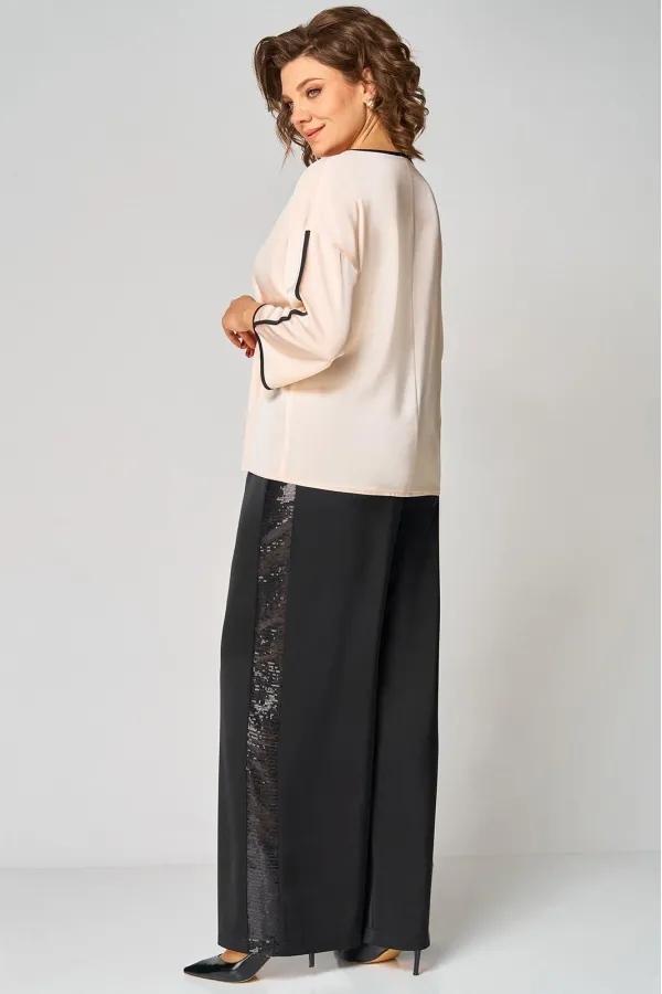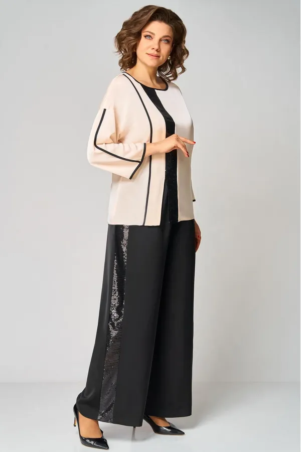 Комплект женский , двухпредметный состоящий из: туники и брюки. Туника прямого силуэта , со спущенной линией плеча . Округлый вырез горловины, обработан бейкой черного цвета. По переду с правой стороны отрезной рельеф , обработан бейкой черного цвета и вставка из пайеток. По переду имеется небольшой разрез. Спинка со средним швом. Рукав одношовный, центр рукава и по низу обработан бейка черного цвета. Длина рукава от горловины – 59см, длина по спинке -63см.Брюки прямые, пояс на эластичной резнике, по боковому шву лампас из пайеток. Длина брюк по боковому шву - 102 см.