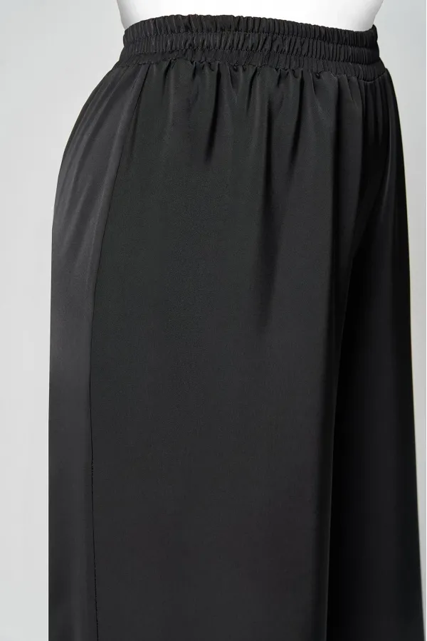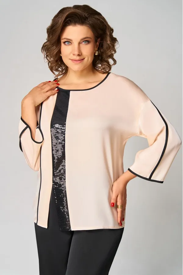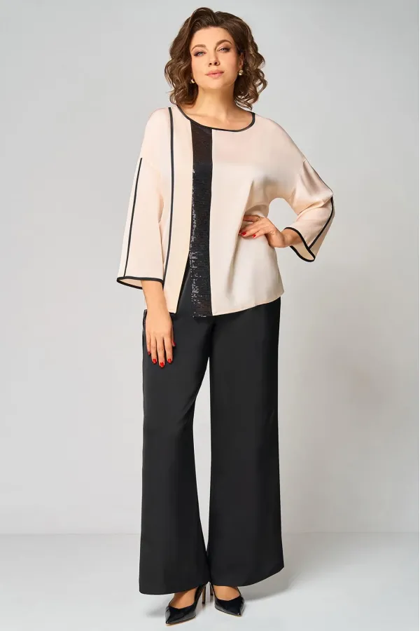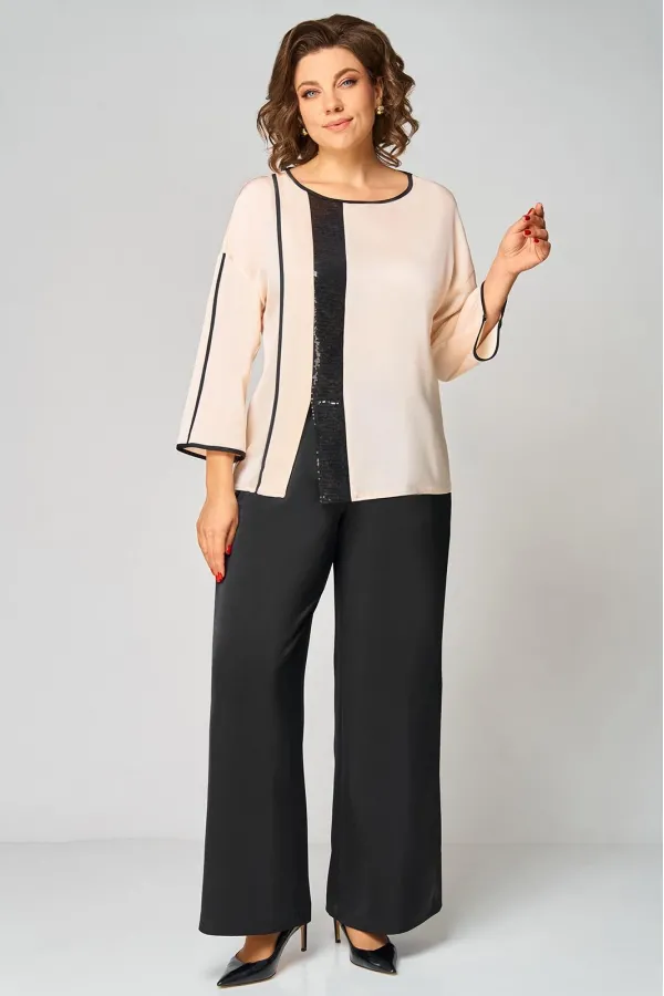 Комплект женский , двухпредметный состоящий из: туники и брюки. Туника прямого силуэта , со спущенной линией плеча . Округлый вырез горловины, обработан бейкой черного цвета. По переду с правой стороны отрезной рельеф , обработан бейкой черного цвета и вставка из пайеток. По переду имеется небольшой разрез. Спинка со средним швом. Рукав одношовный, центр рукава и по низу обработан бейка черного цвета. Длина рукава от горловины – 59см, длина по спинке -63см.Брюки прямые, пояс на эластичной резнике, по боковому шву лампас из пайеток. Длина брюк по боковому шву - 102 см.
