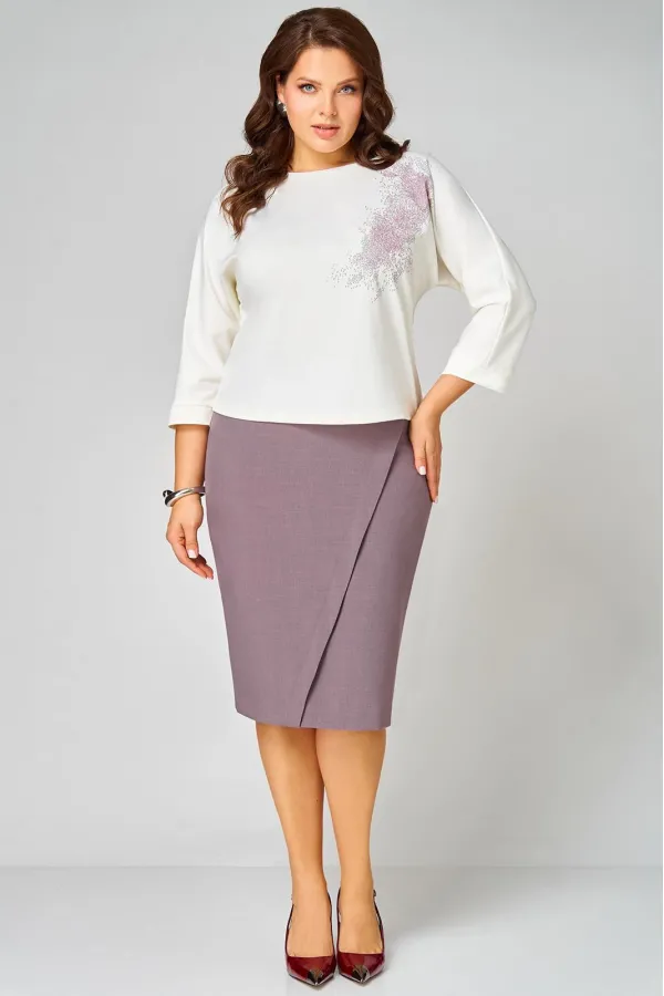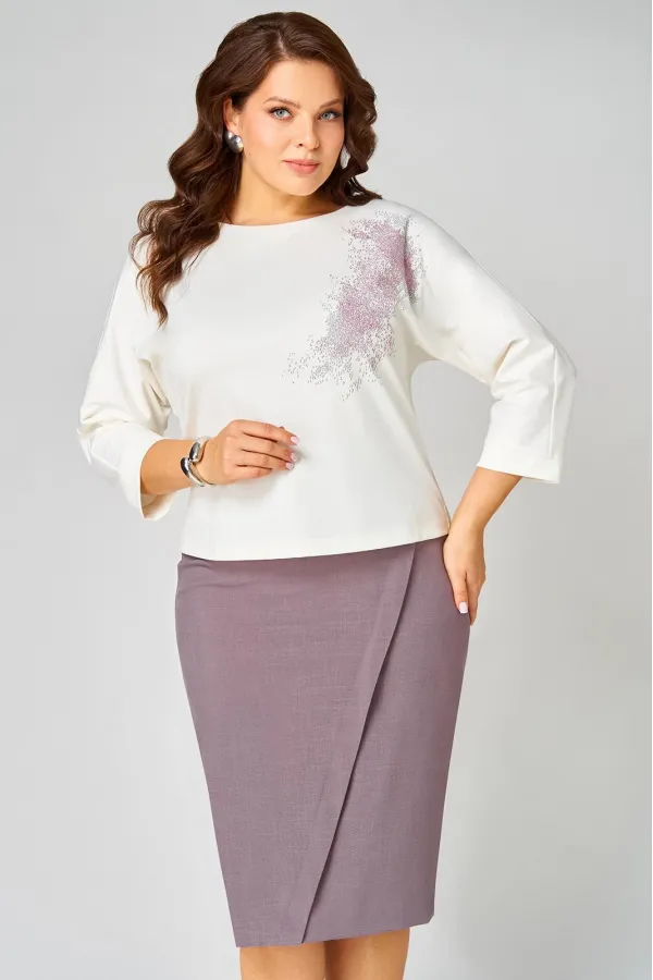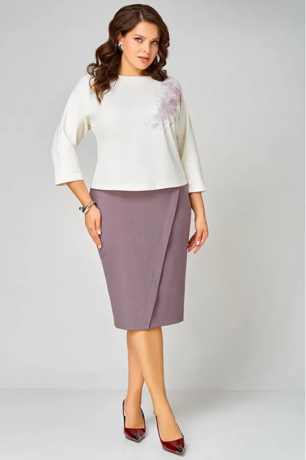 Комплект состоит из туники и юбки. Элегантный костюм не оставит Вас незамеченной и станет Вашей любимой одеждой не только на осенний период, но и в любое время года. Туника трикотажная прямого силуэта со спущенной линией плеча. По левой части переда декоративная печать. Рукав одношовный укороченный с манжетой по низу. Юбка на подкладке слегка заужена к низу, изготовлена из текстильной ткани. По переду частично отлетная правая часть с имитацией запаха. Заднее полотнище юбки со средним швом и разрезом по низу. По верху юбки притачной пояс с резинкой по бокам.