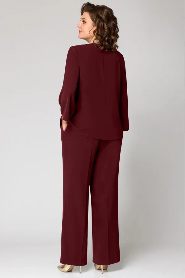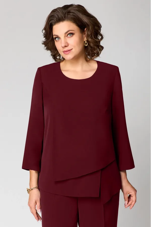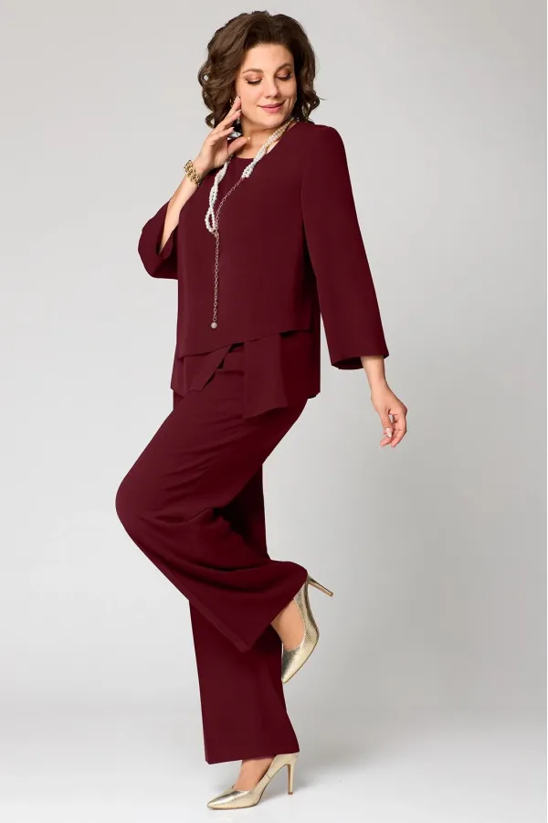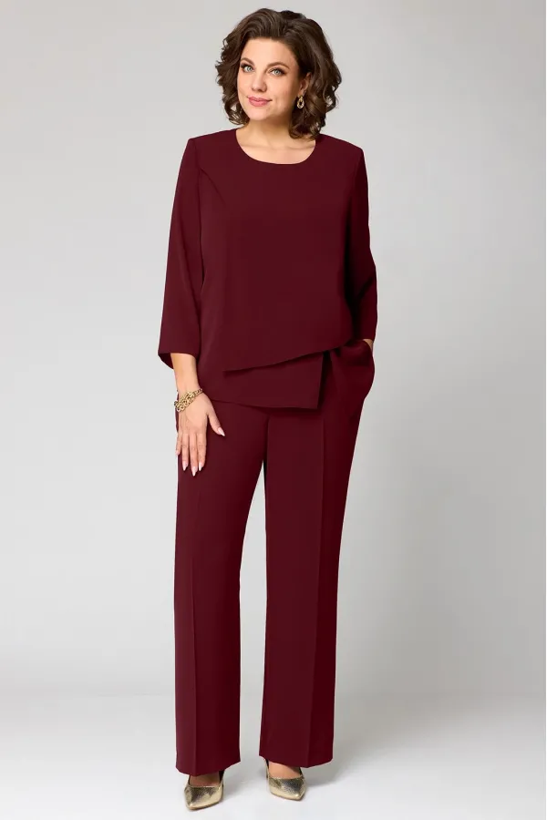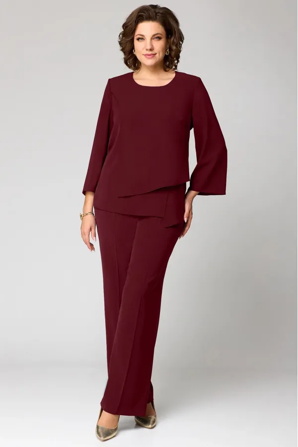 Элегантный женский комплект прямого силуэта из легкой струящейся ткани.Туника прямого силуэта. Перед состоит из нижней детали и с боковым подрезом и шлицей с левой стороны, нагрудные вытачки идут от плечевого среза . Верхняя деталь переда ассиметричной формы. Спинка со средним швом и застежкой на потайную тесьму-молнию. Округлый вырез горловины. Рукав втачной одношовный. Брюки прямого силуэта на притачном поясе, с посадкой на талии, с застежкой на тесьму- молнию и 1 пуговицу и петлю, с боковыми наклонными карманами на передних половинках брюк . По передним половинкам брюк заутюжены стрелки. Для лучшего прилегания брюк в области талии в поясе со стороны спинки вставлена резинка.