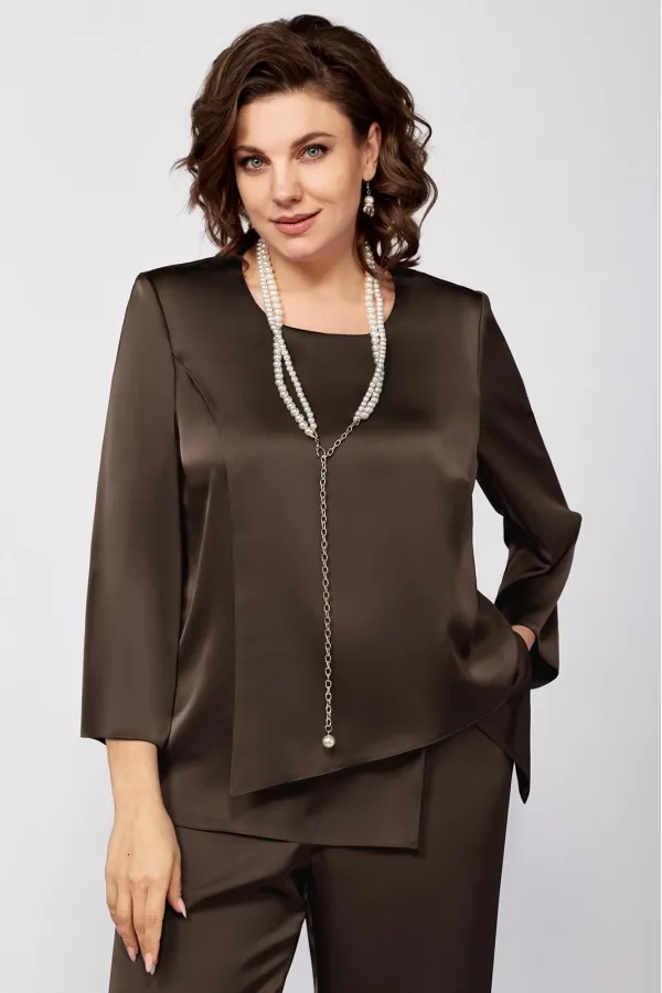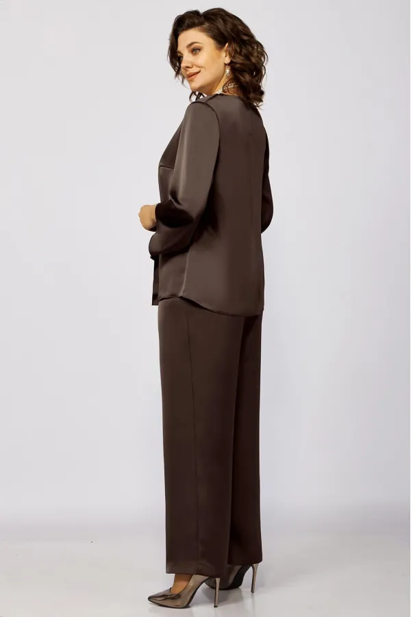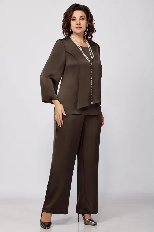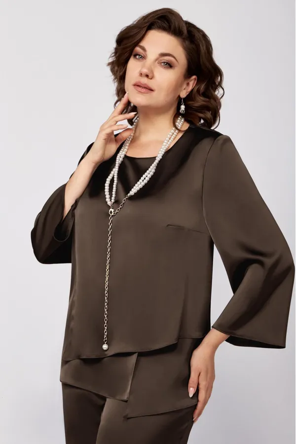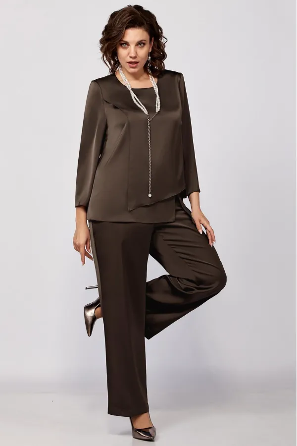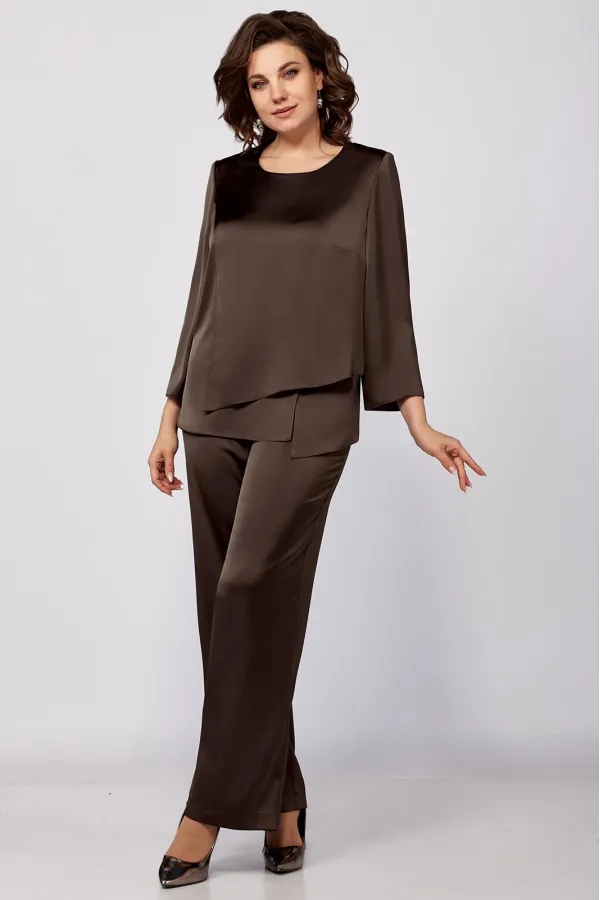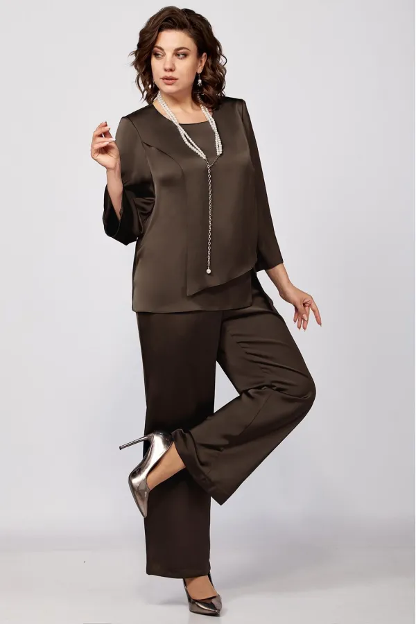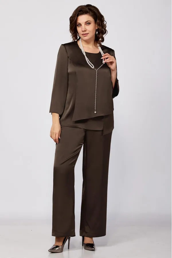 Элегантный женский комплект прямого силуэта из легкой струящейся ткани.Туника прямого силуэта. Перед состоит из нижней детали и с боковым подрезом и шлицей с левой стороны, нагрудные вытачки идут от плечевого среза . Верхняя деталь переда ассиметричной формы. Спинка со средним швом и застежкой на потайную тесьму-молнию. Округлый вырез горловины. Рукав втачной одношовный. Брюки прямого силуэта на притачном поясе, с посадкой на талии, с застежкой на тесьму- молнию и 1 пуговицу и петлю, с боковыми наклонными карманами на передних половинках брюк . По передним половинкам брюк заутюжены стрелки. Для лучшего прилегания брюк в области талии в поясе со стороны спинки вставлена резинка. Укарашение в комплект не входит.