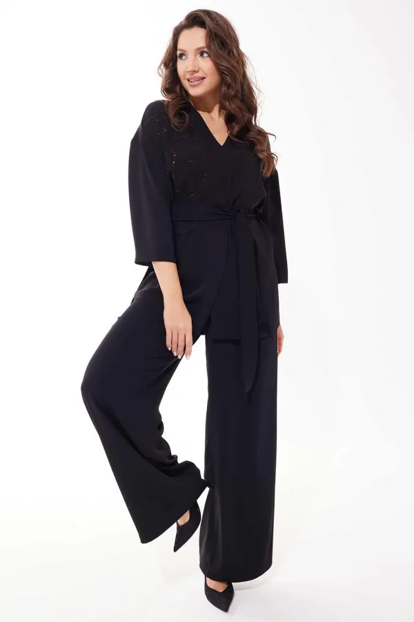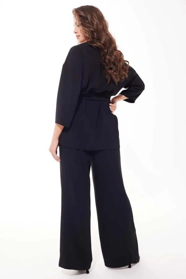 Костюм женский, состоящий из жакета и брюк. Жакет прямого силуэта с V-образным вырезом, спущенный рукав. У жакета центральная застежка на потайные кнопки. На правой полочке декоративная вышивка из пайеток. В боковых швах обработаны разрезы. Брюки палаццо, на притачном поясе с резинкой и тесьмой. У брюк - боковые карманы.