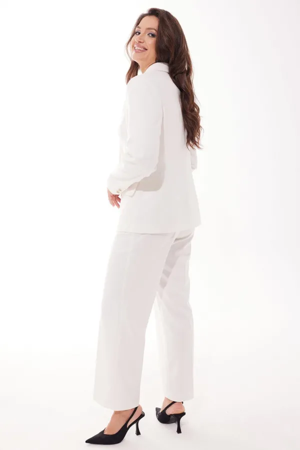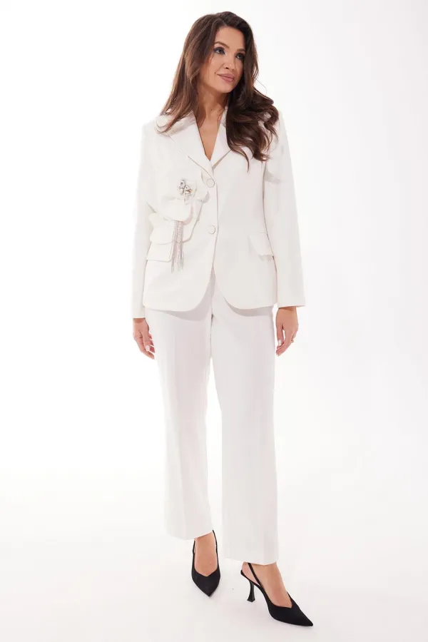 Костюм брючный, состоит из жакета и брюк. Жакет полуприлегающего силуэта, на подкладке, с центральной бортовой застежкой на 2 петли и пуговицы. Воротник отложной, на стойке. Рукав втачной, двухшовный со шлицей по низу и обработан 2-мя декоративными пуговицами. Карманы прорезные с клапаном. Спинка со средним швом. Декоративный цветок-украшение в комплект не входит. Брюки зауженные к колену, расклешенные к низу. Пояс притачной, застежка на молнию. Брюки без карманов.