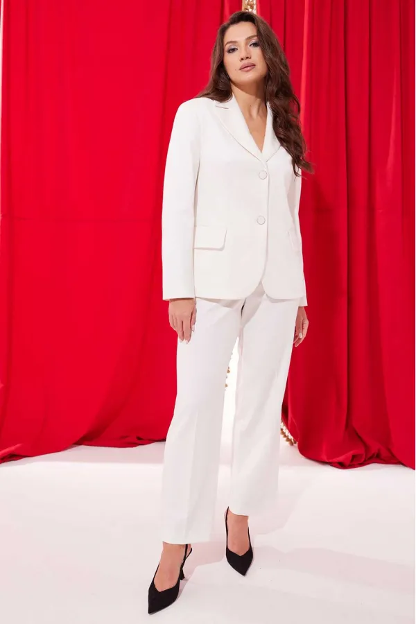 Костюм брючный, состоит из жакета и брюк. Жакет полуприлегающего силуэта, на подкладке, с центральной бортовой застежкой на 2 петли и пуговицы. Воротник отложной, на стойке. Рукав втачной, двухшовный со шлицей по низу и ... Читать далее...