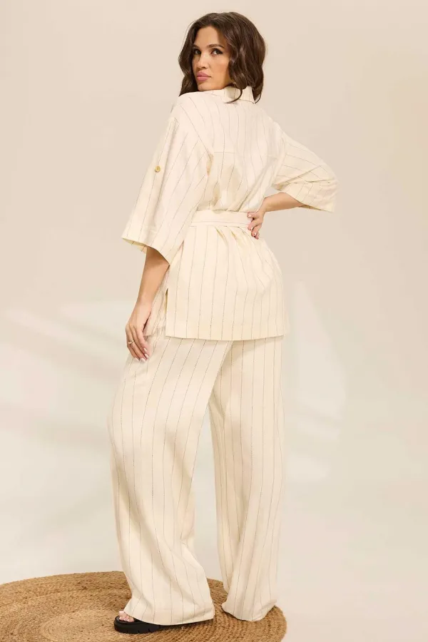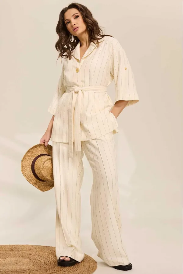 Костюм женский, состоит из блузы и брюк. Блуза прямого силуэта. Застежка центральная на 2 петли-пуговицы. воротник пиджачного типа. Блуза без карманов. Рукав внизу на резинке, в боковых швах блузы - разрезы. Брюки прямые на резинке со шнурком, свободные, прямые, с боковыми карманами. Дополняет костюм съемный пояс.