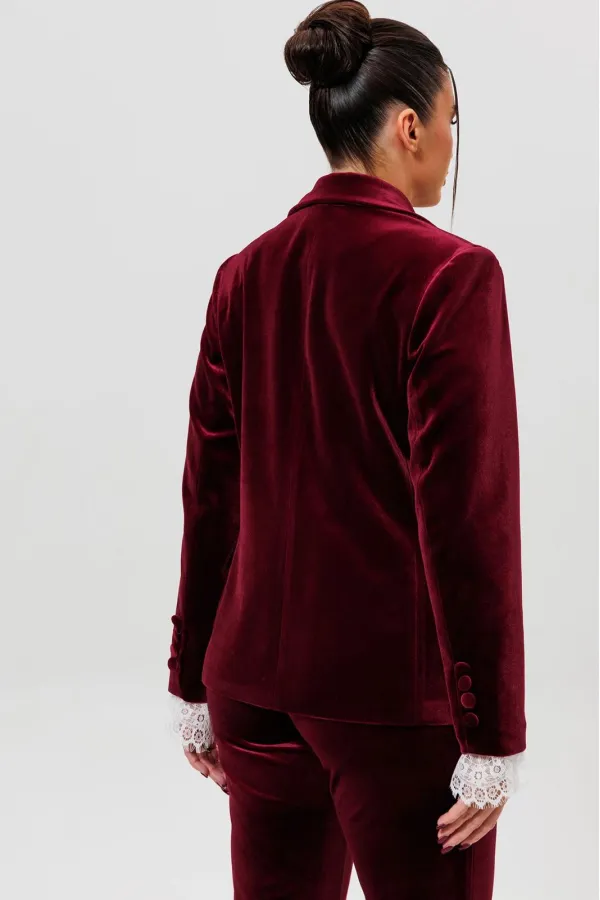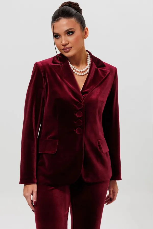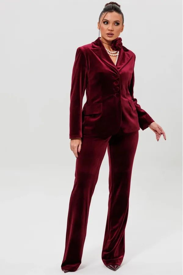 Встретьте Новый год в безупречном образе с этим роскошным бордовым бархатным костюмом. Модель состоит из полуприлегающего жакета на подкладке и эффектных брюк, которые плавно расклешены к низу, создавая женственный и динамичный силуэт. Жакет с отложным воротником и декоративными пуговицами на рукавах подчеркивает стройность фигуры. Его можно носить отдельно с джинсами или юбками, делая образ универсальным. Брюки с притачным поясом удобно сидят по фигуре. Этот праздничный костюм бордового цвета — идеальный выбор для главной ночи года, который подарит вам уверенность и комфорт.