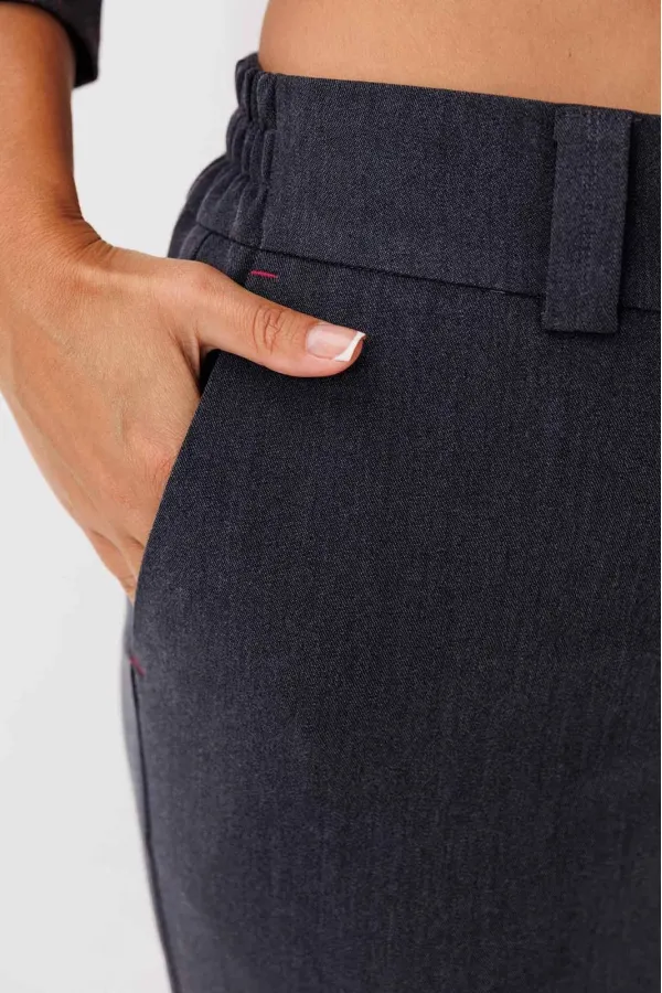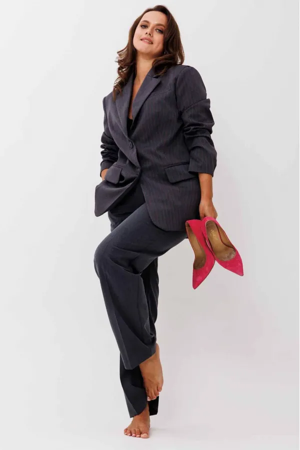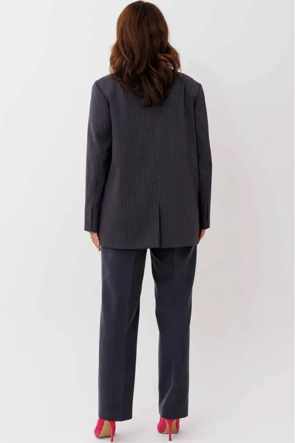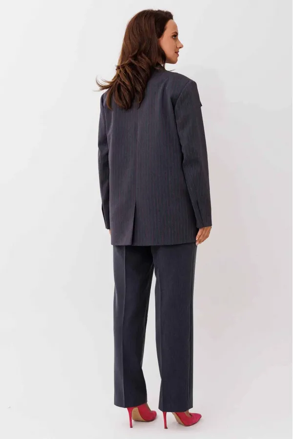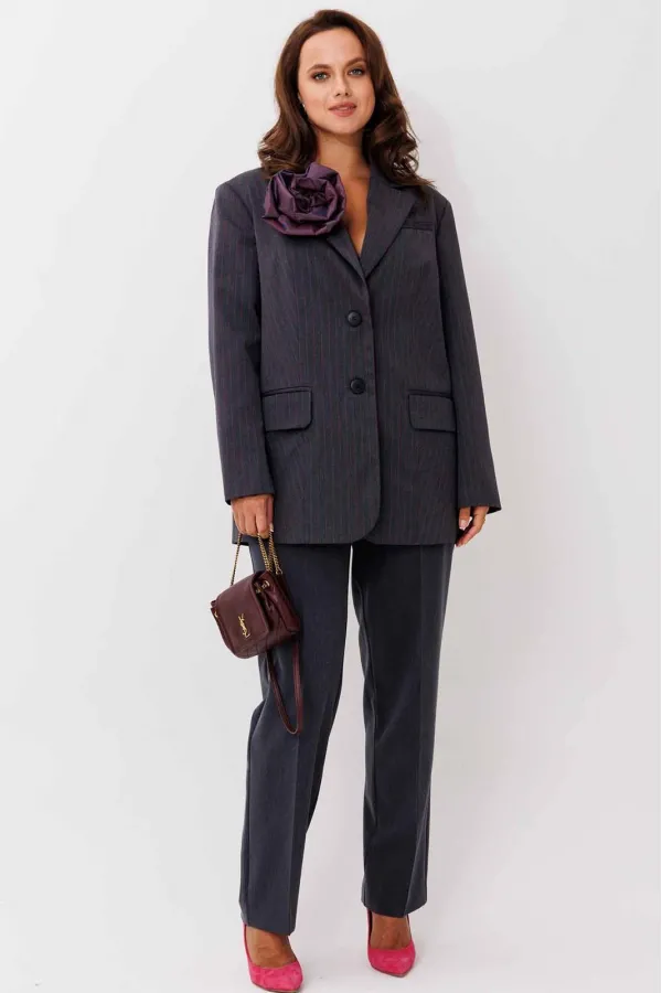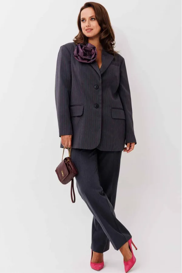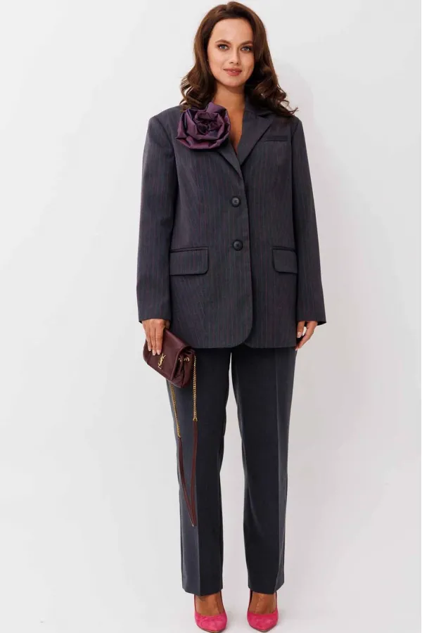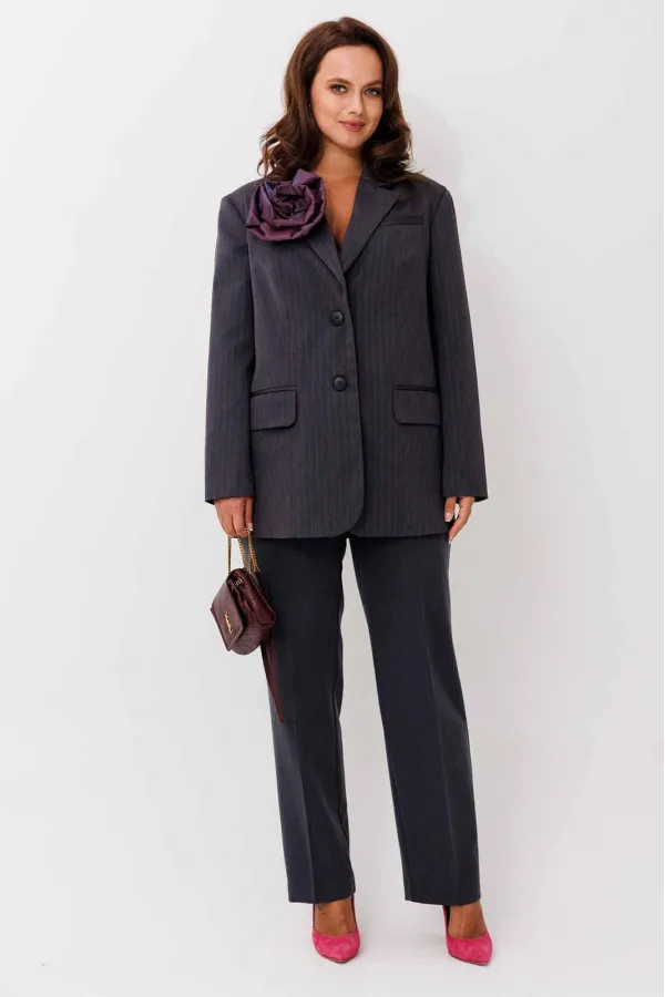 Костюм женский, состоит из жакета и брюк. Жакет полуприлегающего силуэта удлинённый, с центральной застёжкой на две прорезные петли и пуговицы. Перёд жакета с талевыми вытачками и прорезными карманами с клапанами. Лацканы классической формы. Спинка со средним швом и шлицей с разрезом. Рукава втачные двух шовные, по низу декоративная отделка. Жакет на подкладке. Брюки женские с высокой посадкой, прямые, на притачном поясе, по спинке по бокам продета эластичная тесьма - резинка. По переду застёжка молния с гульфиком и откоском. Брюки с боковыми карманами . На задних половинках брюк имитация прорезных карманов с листочкой. Декоративный цветок-брошь - под запрос (дополнительная оплата).