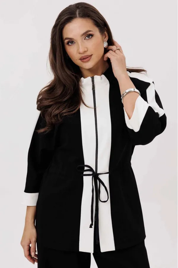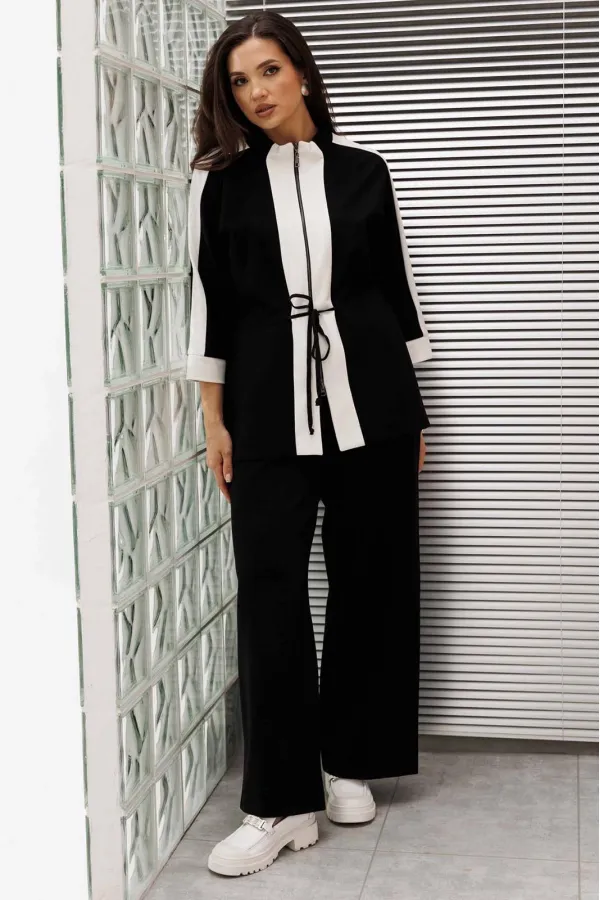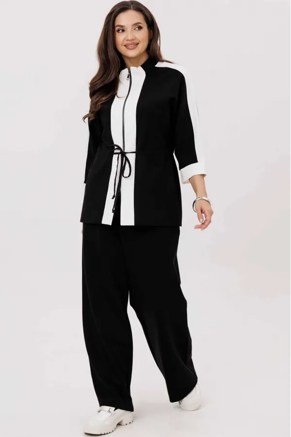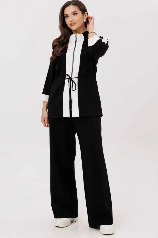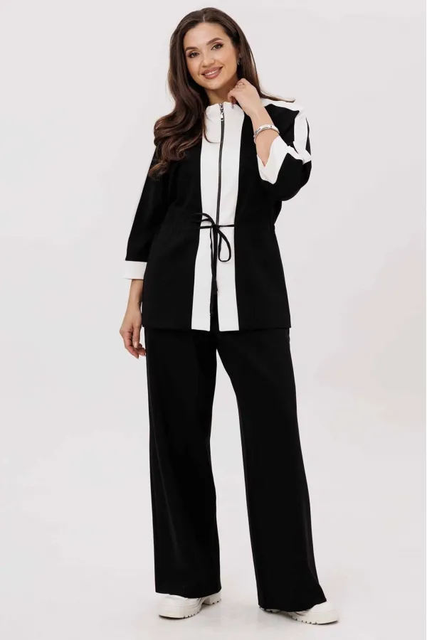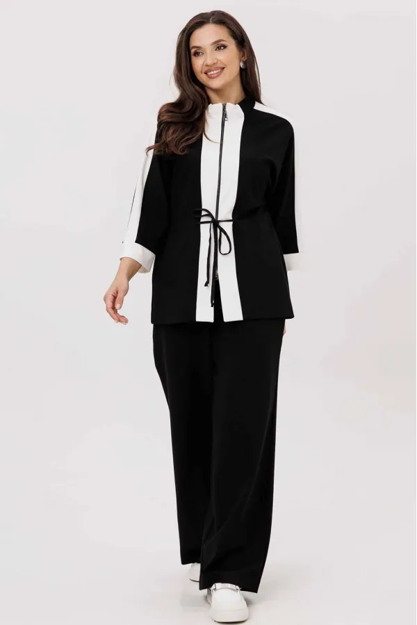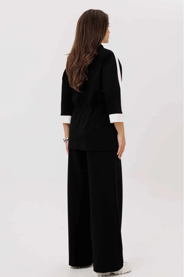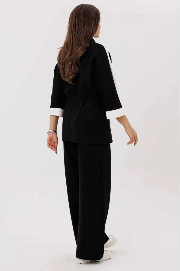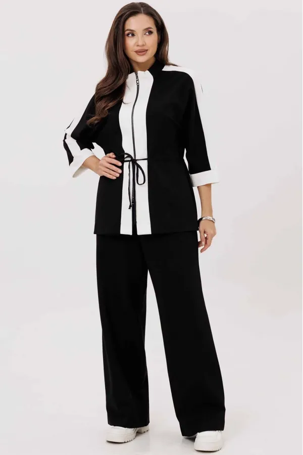 Костюм женский, состоит из жакета и брюк. Жакет прямого силуэта, с застежкой на декоративную тесьму-молнию по центру. На талии кулиса на завязке. Рукав «Летучая мышь», низ рукава обработан притачной манжетой. По верху рукава и центру переда контрастные вставки. Жакет без подкладки. Брюки палаццо, на притачном поясе с резинкой и тесьмой. У брюк - боковые карманы.