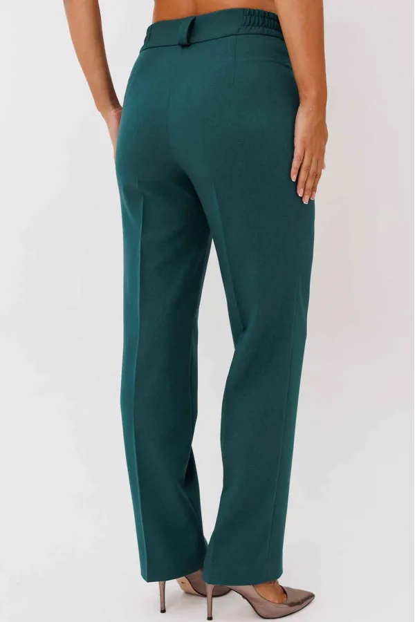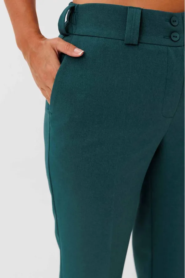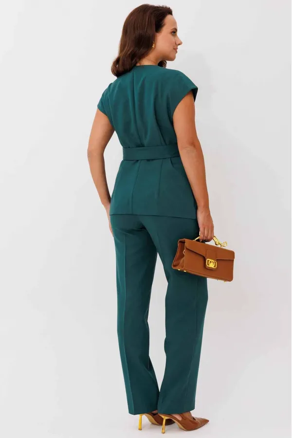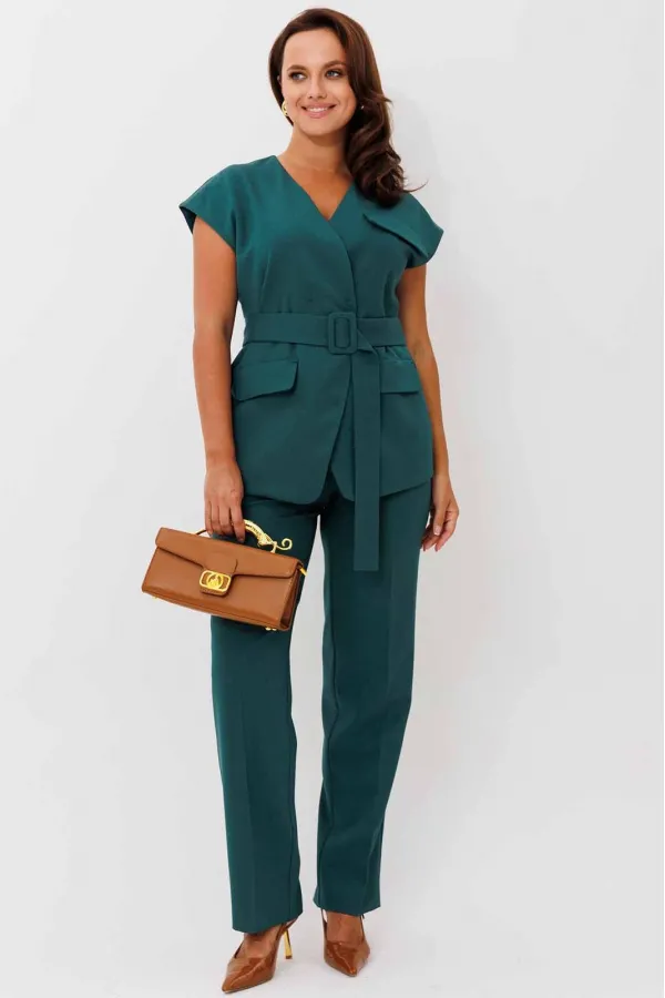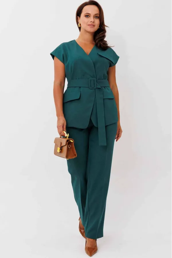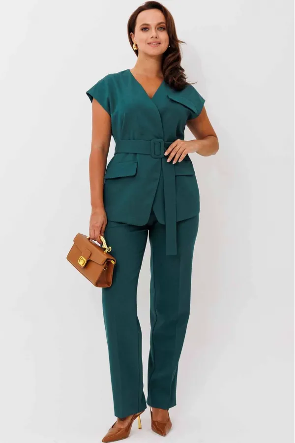 Костюм женский, состоящий из жилета и брюк. Жилет полуприлегающего силуэта, без подкладки. Плечо спущенное.Вырез V - образный, с воротником стойкой. По переду иммитация карманов с клапаном. Центральная застежка на пришивные кнопки. Спинка со средним швом и вытачками. Брюки прямого силуэта, слегка зауженные к низу. Пояс частично на резинке (по бокам), с шлевками для ремня. Застежка на гульфик с молнией и пуговицей. По бокам карманы с косым входом. Материал костюма костюмный, средней плотности, с гладкой фактурой. Без подкладки. Дополняет модель широкий пояс.