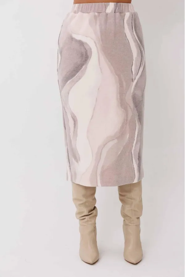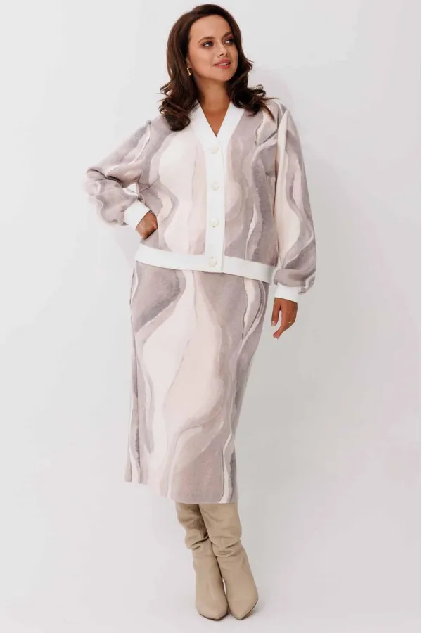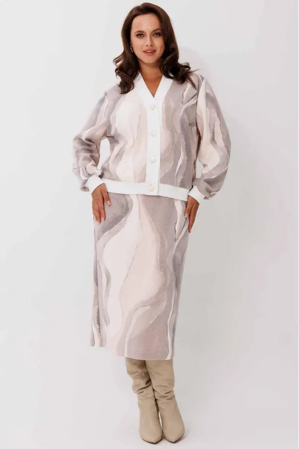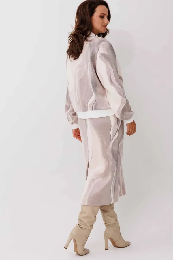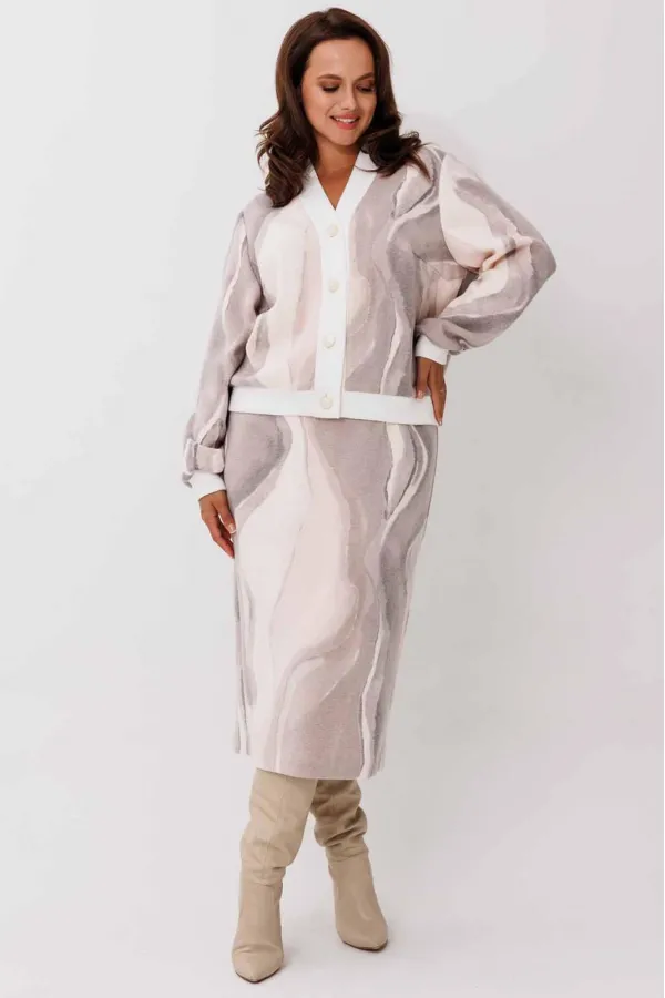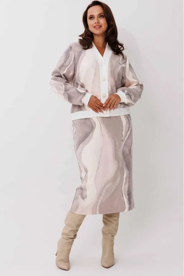 Костюм женский трикотажный (жакет + юбка) Костюм выполнен из мягкого трикотажного полотна с оригинальным принтом в плавных пастельных тонах. Комплект состоит из жакета и юбки миди-длины.