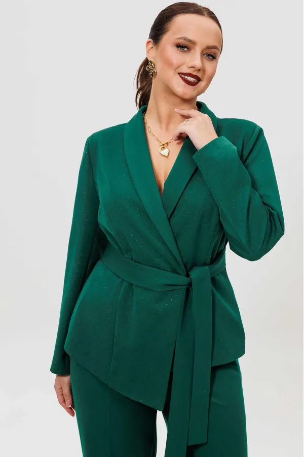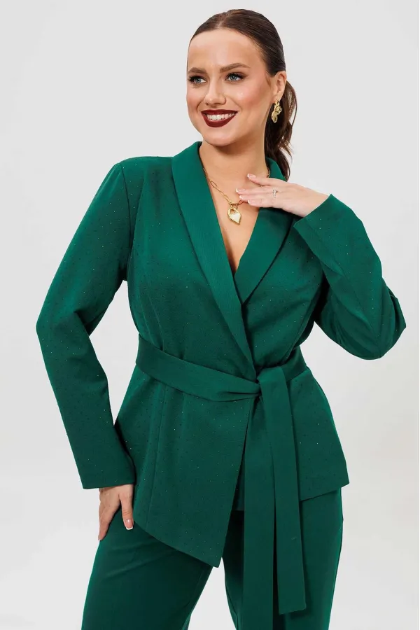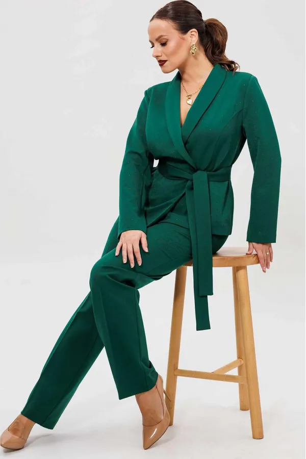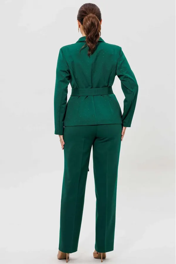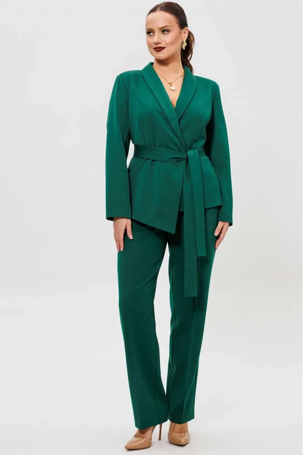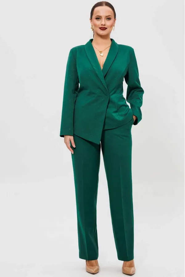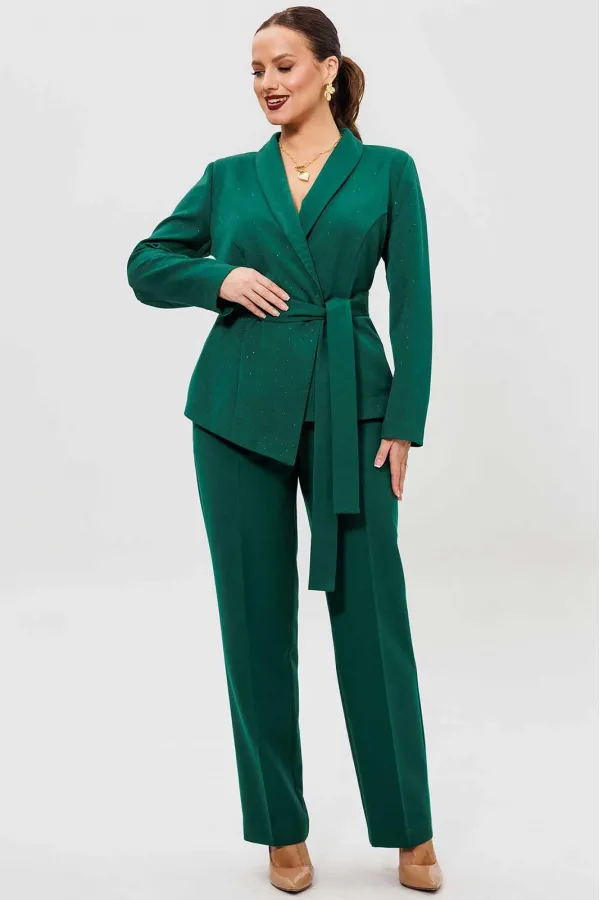 Элегантный женский костюм из зеленой костюмной ткани — идеальный выбор для тех, кто ценит комфорт и стиль в повседневной жизни. Женский брючный костюм, состоящий из жакета и брюк. Жакет полуприлегающего силуэта, двубортный, с застежкой на две кнопки. Воротник английский. Рукав втачной. По бокам рельефные швы, формирующие силуэт. На уровне груди предусмотрены нагрудные вытачки. Брюки прямого силуэта, слегка зауженные к низу. Пояс частично на резинке (по бокам), с шлевками для ремня. Застежка на гульфик с молнией и внутренним крючком. По бокам боковые карманы с косым входом. Материал костюма костюмный, средней плотности, ткань жакета украшена мелкими стразами в тон костюма, ткань брюк с гладкой фактурой. Без подкладки. Дополняет модель широкий пояс Этот костюм станет отличным дополнением к вашему гардеробу, позволяя создавать модные и стильные образы каждый день.