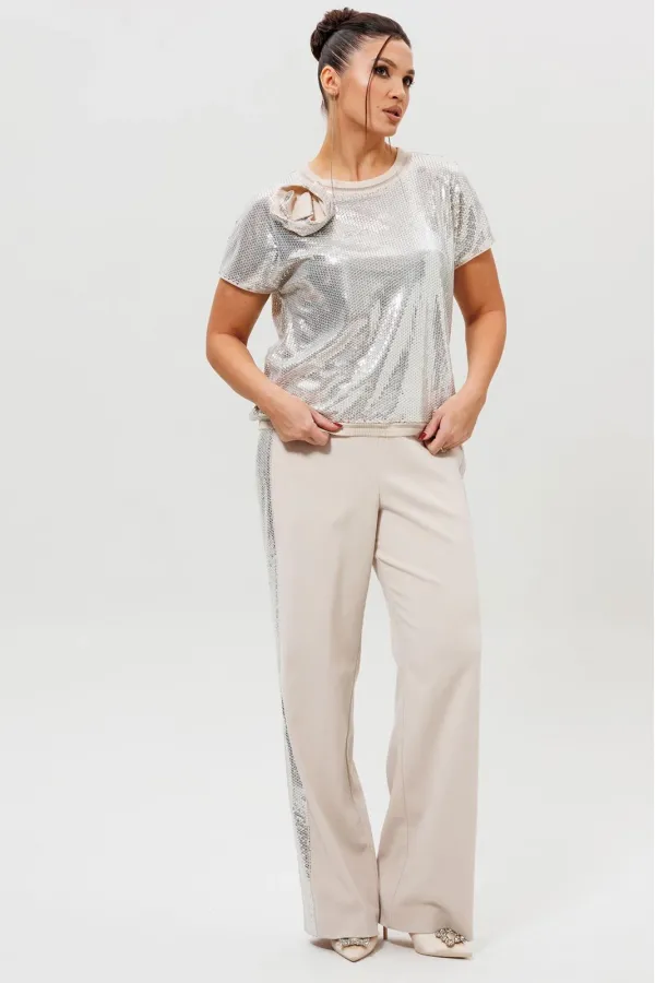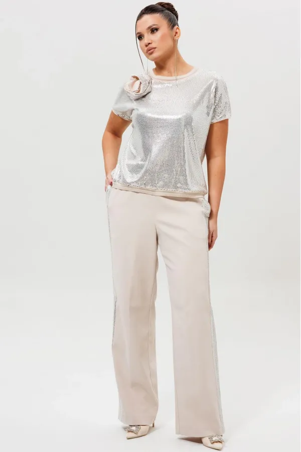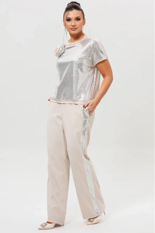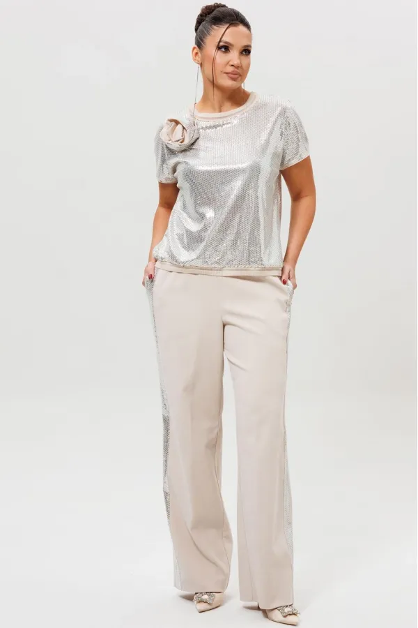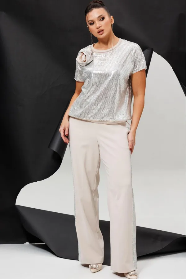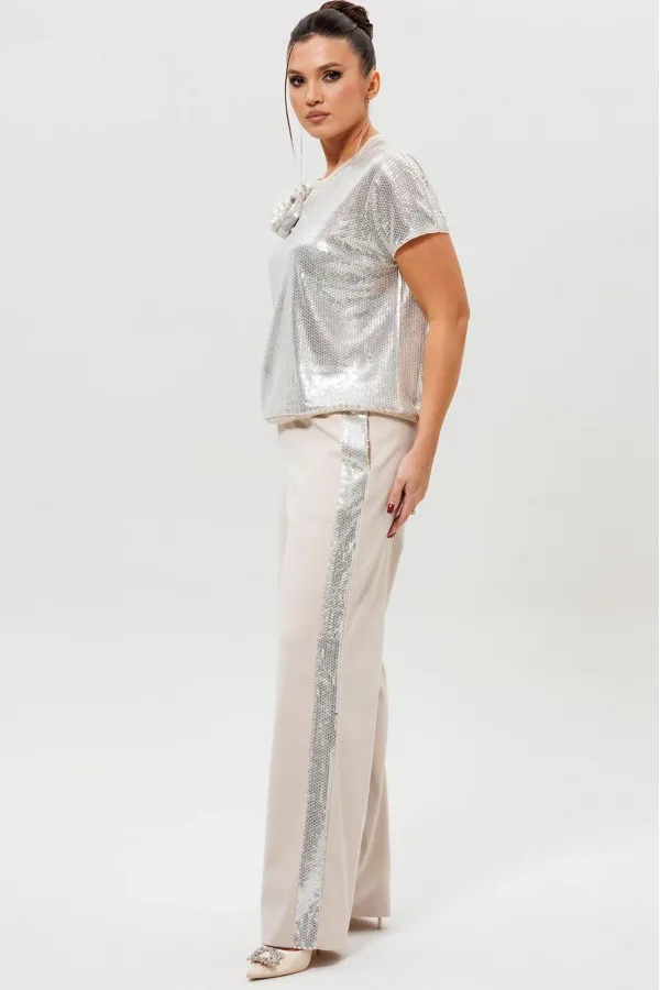 Серебристый костюм состоит из жакета с пайетками и брюк с декоративными лампасами. Этот роскошный серебристый костюм (Арт. 1277) создан для того, чтобы вы сияли на любом торжестве. Комплект включает в себя жакет и элегантные брюки с декоративными лампасами, которые зрительно вытягивают силуэт и добавляют образу строгости и шика. Особый шарм костюму придает цветок-брошь из той же ткани, которая может быть использована как на лацкане жакета, так и в прическе. Костюм с пайетками и лампасами — это готовое решение для новогодней ночи, свадьбы, выпускного вечера или любого события, где ваш образ должен быть безупречным. Размеры 48-54.