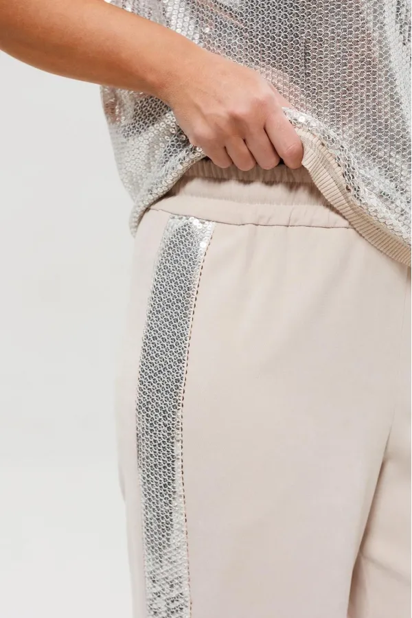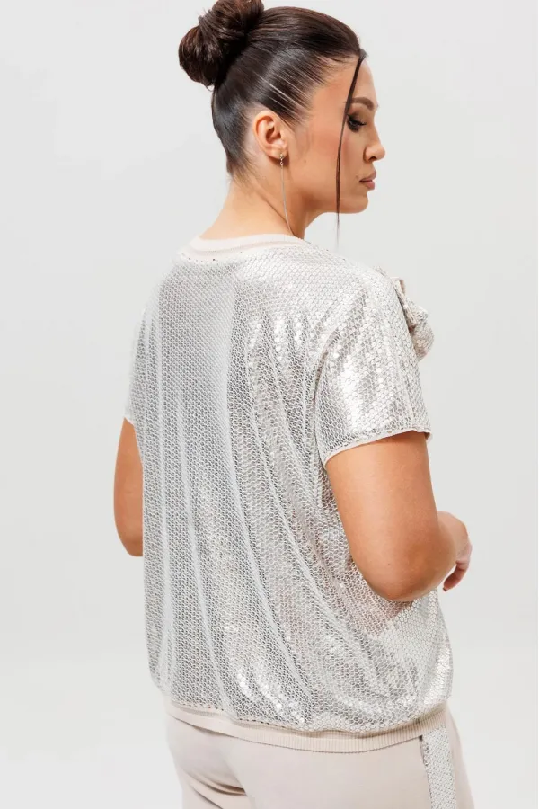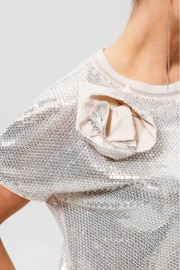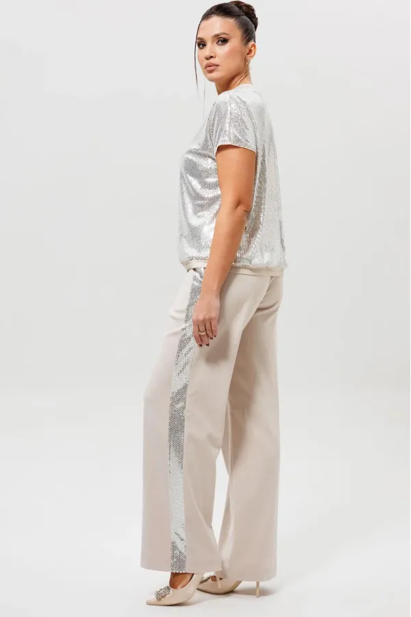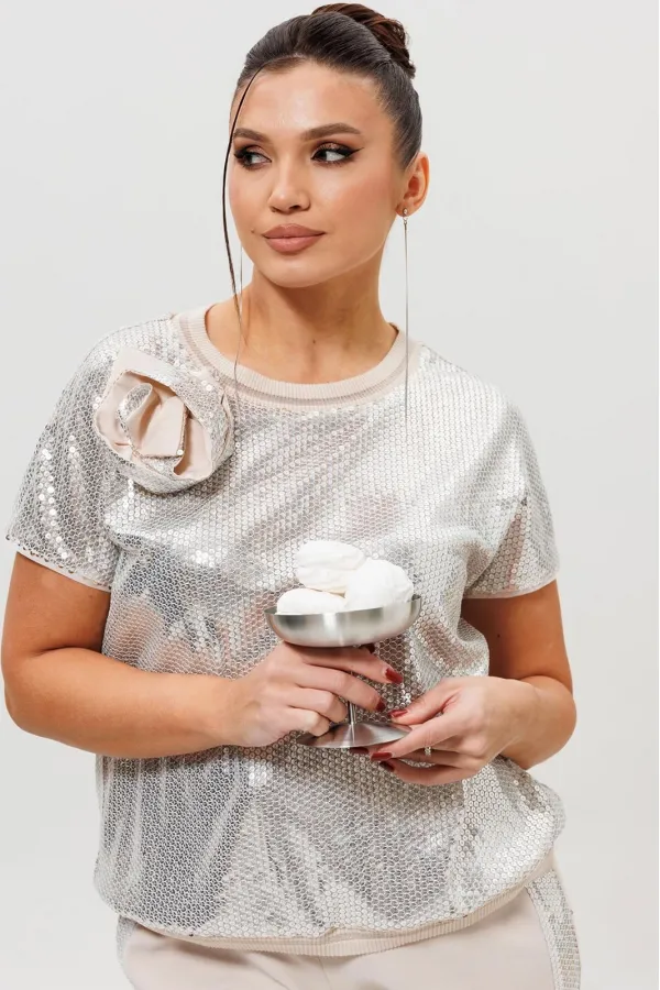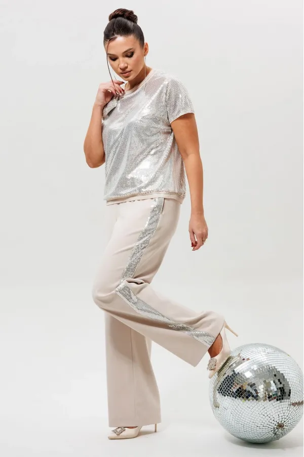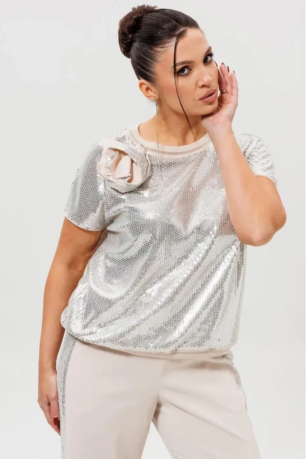 Серебристый костюм состоит из жакета с пайетками и брюк с декоративными лампасами. Этот роскошный серебристый костюм (Арт. 1277) создан для того, чтобы вы сияли на любом торжестве. Комплект включает в себя жакет и элегантные брюки с декоративными лампасами, которые зрительно вытягивают силуэт и добавляют образу строгости и шика. Особый шарм костюму придает цветок-брошь из той же ткани, которая может быть использована как на лацкане жакета, так и в прическе. Костюм с пайетками и лампасами — это готовое решение для новогодней ночи, свадьбы, выпускного вечера или любого события, где ваш образ должен быть безупречным. Размеры 48-54.
