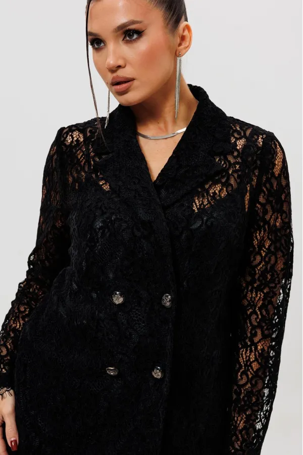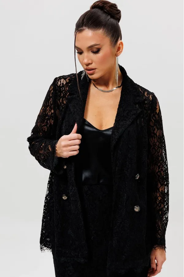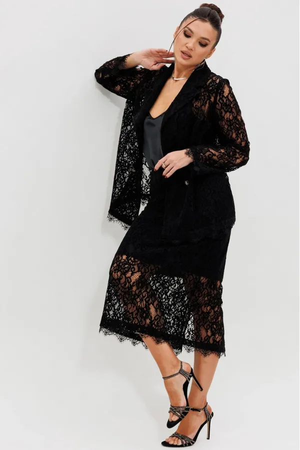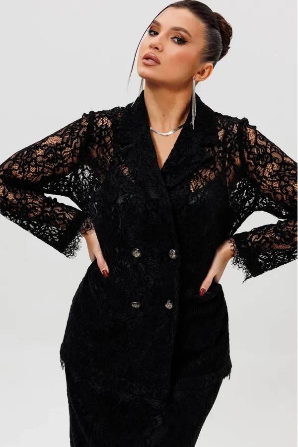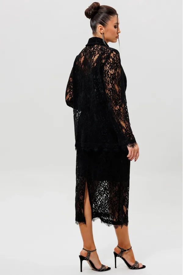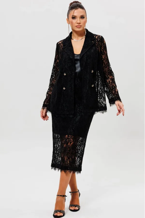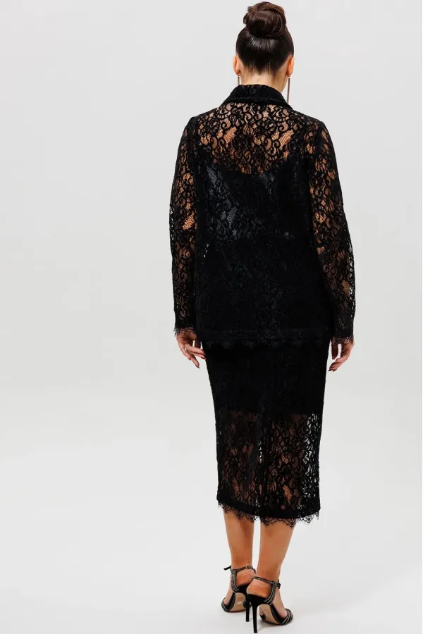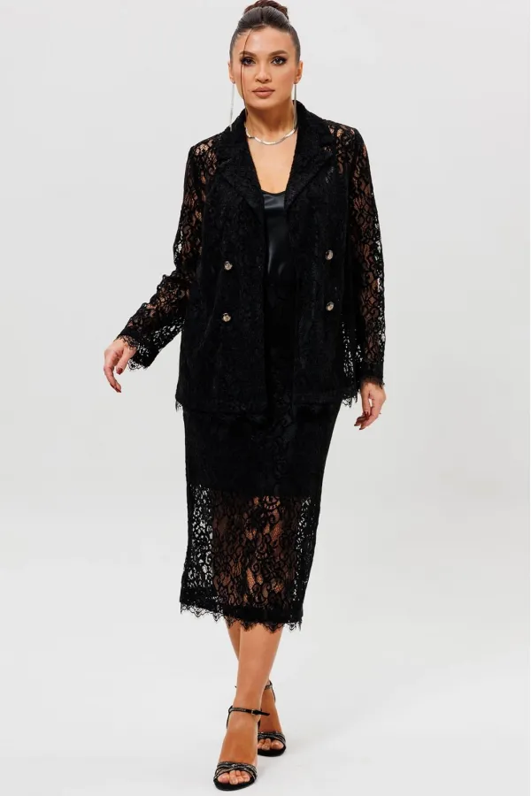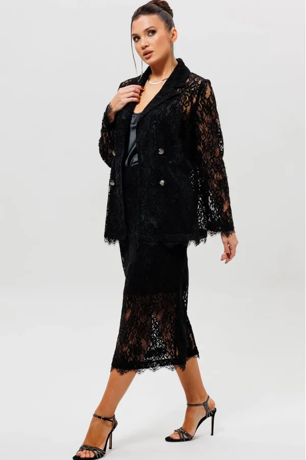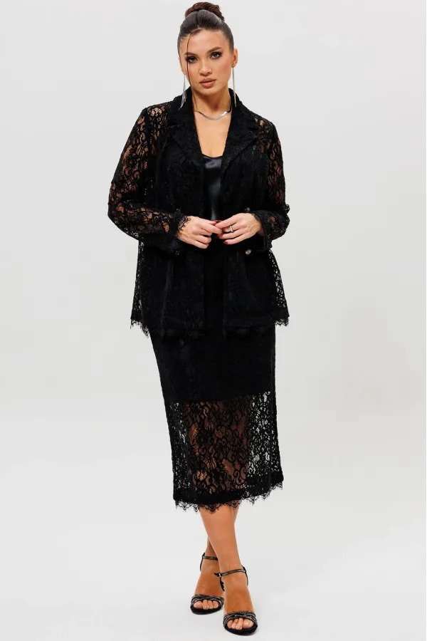 Этот гармоничный кружевной костюм с юбкой (Арт. 1284) выполнен в соблазнительной черной гамме. Комплект сочетает полуприлегающий жакет на подкладке и элегантную юбку из эластичной сетки с ажурным бархатным узором. Жакет с кружевными рукавами и лаконичным кроем создает утонченный верх, в то время как кружевная юбка подчеркивает женственность силуэта. Как и в других моделях коллекции, ткань обладает небольшой прозрачностью, поэтому для полного образа мы рекомендуем дополнить комплект однотонным топом (арт.1164) или бюстье. Этот ажурный костюм — идеальный выбор для романтического свидания, торжественного ужина или любого события, где вы хотите выглядеть неотразимо.