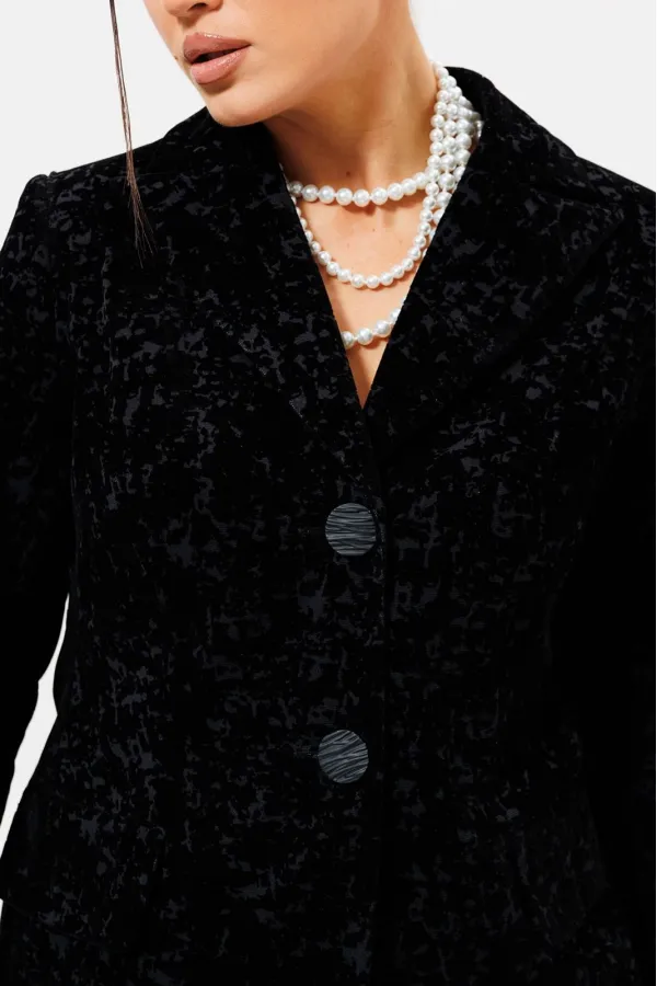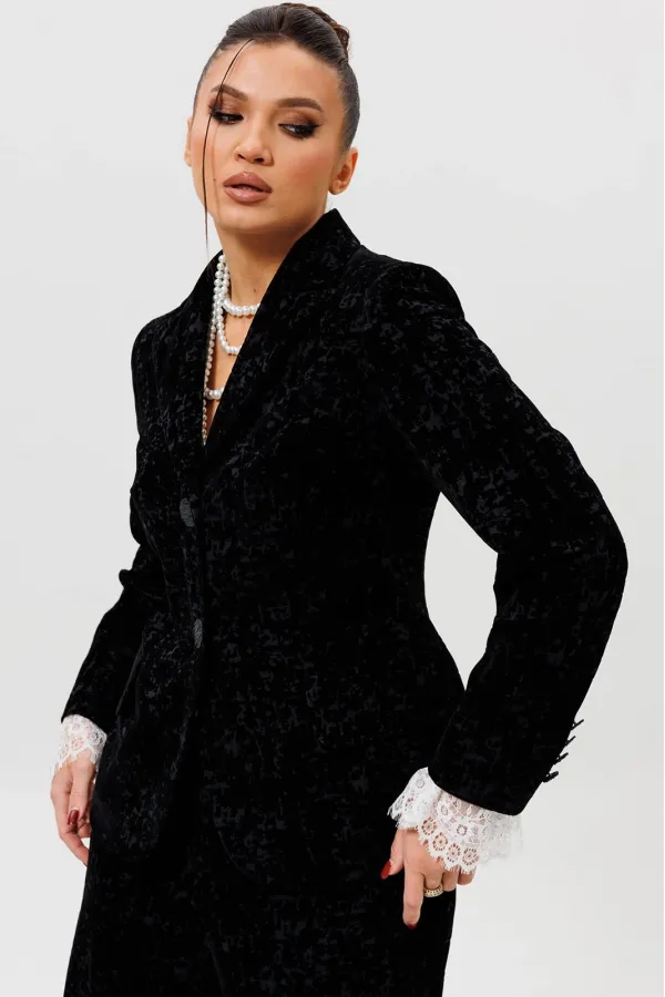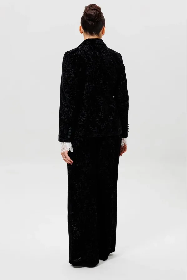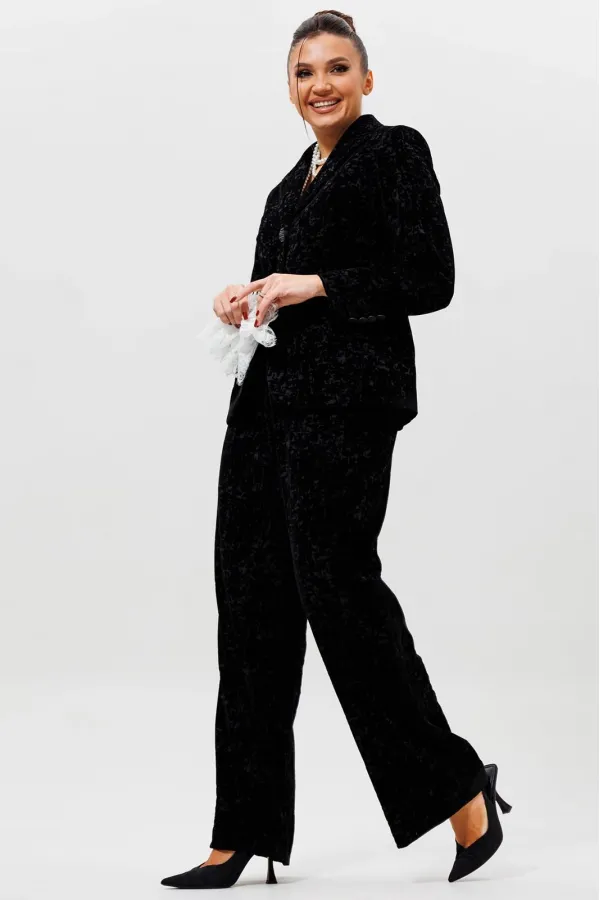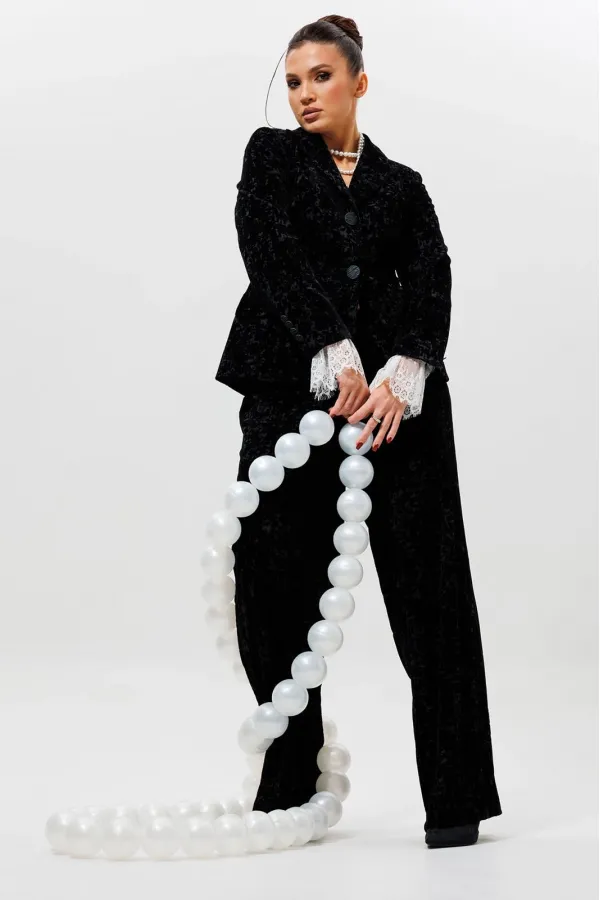 Этот черный бархатный костюм (жакет и брюки) — воплощение вечерней элегантности. Комплект из жакета и чуть прямых брюк на подкладке станет основой для безупречного праздничного образа. Жакет с притягивает взгляды и красиво переливается при свете софитов и вечерних огней, делая его идеальным выбором для выхода в ресторан, театр или на новогодний корпоратив. Крой жакета позволяет комбинировать его с брюками и юбками с высокой талией, визуально вытягивая силуэт. Бархатные брюки (на резинке) прямого кроя выгодно оттеняют нарядный верх и обеспечивают комфорт. Такой костюм для праздника можно носить с кружевной или шелковой блузкой, создавая разные стилистические вариации. Этот элегантный костюм подчеркнет ваш безупречный вкус и станет выигрышной инвестицией в гардероб. Модель можно дополнить кружевными манжетами (арт. 1285м).
