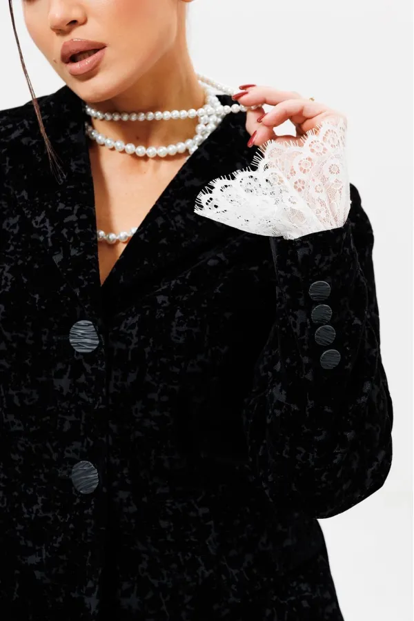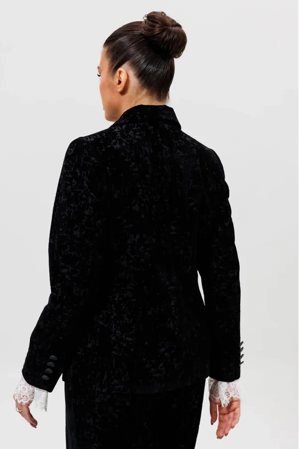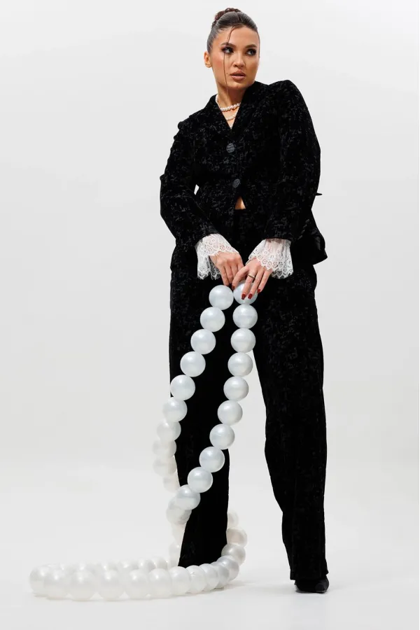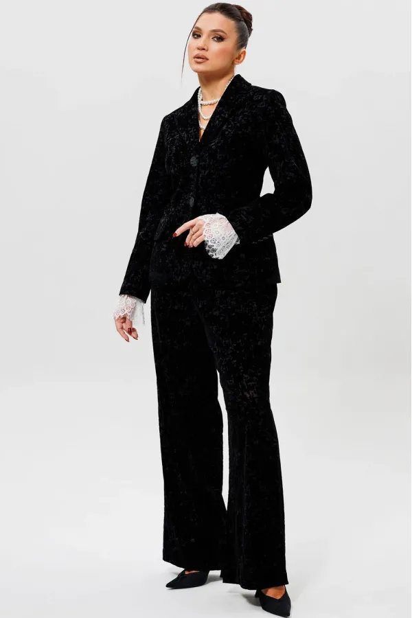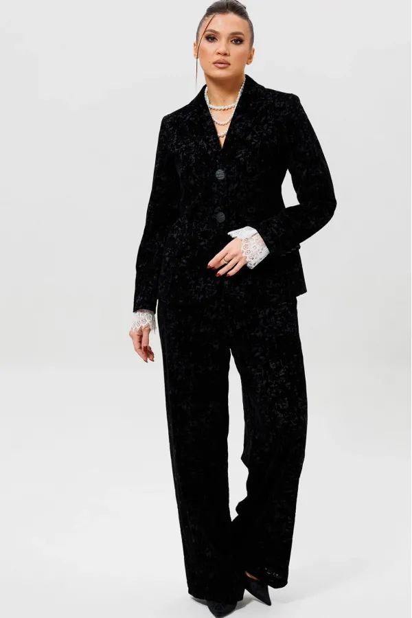 Этот черный бархатный костюм (жакет, манжеты и брюки) — воплощение вечерней элегантности. Комплект из жакета и чуть прямых брюк на подкладке станет основой для безупречного праздничного образа. Жакет с притягивает взгляды и красиво переливается при свете софитов и вечерних огней, делая его идеальным выбором для выхода в ресторан, театр или на новогодний корпоратив. Крой жакета позволяет комбинировать его с брюками и юбками с высокой талией, визуально вытягивая силуэт. Бархатные брюки (на резинке) прямого кроя выгодно оттеняют нарядный верх и обеспечивают комфорт. Такой костюм для праздника можно носить с кружевной или шелковой блузкой, создавая разные стилистические вариации. Этот элегантный костюм подчеркнет ваш безупречный вкус и станет выигрышной инвестицией в гардероб. Дополняют модель кружевные манжеты, которые фиксируются по руке на резинку