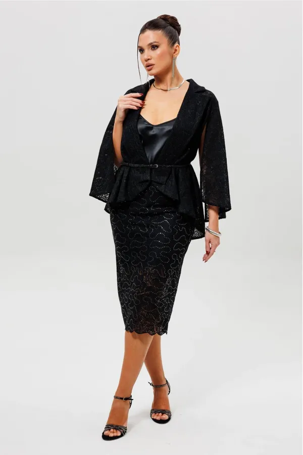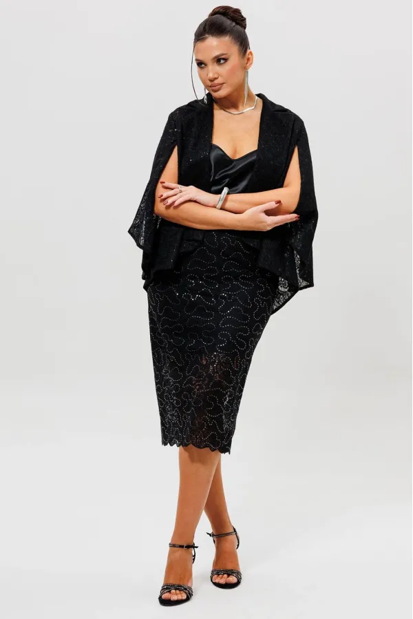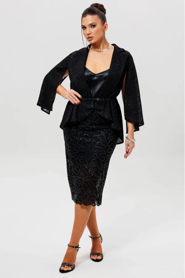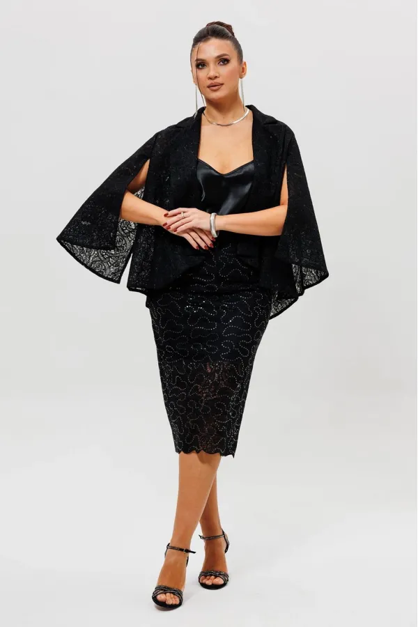 Костюм (жакет, топ, юбка) выполнен из кружевной ткани на основе сетки. На ткани кейпа и юбки пришиты пайетки, которые придают лёгкое мерцание. В кейпе низ изделия и низ рукава фигурные. Силуэт прямой, расширен к низу. Воротник пиджачного типа. Рукав пришит только по окату верхней части, что придаёт эффект отлетного рукава. Всё изделие обработано сеткой в цвет ткани с изнаночной стороны. Юбка на подкладке, прямого силуэта, заужена к низу. На переднем полотнище юбки обработаны талиевые вытачки. На заднем полотнище юбки есть средний шов, который заканчивается разрезом. Обработаны талиевые вытачки. Топ выполнен из атласной ткани. Изделие прямого силуэта с нагрудными вытачками. Перед фигурный, обработан окантовкой, так же, как и низ изделия. Бретели регулируются. Представляем готовый костюм с кейпом, блузой и юбкой, создающий целостный и невероятно эффектный образ для самого особого случая. В комплект входит черный кружевной кейп (Арт. 1278) с мерцающей изнутри отстрочкой-«змейкой» и соответствующая ему кружевная юбка, где та же самая декоративная отстрочка с пайетками выведена на внешнюю сторону, создавая перекликающиеся акценты. Такой костюм с накидкой — идеальное решение для свадьбы в качестве наряда для гостей, торжественного выхода в театр или романтического ужина. Юбка с пайетками и лаконичный кейп вместе создают гармоничный и запоминающийся ансамбль, подчеркивающий ваш утонченный вкус.