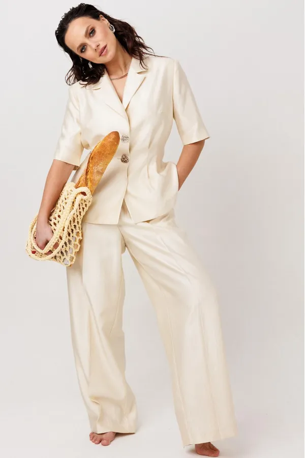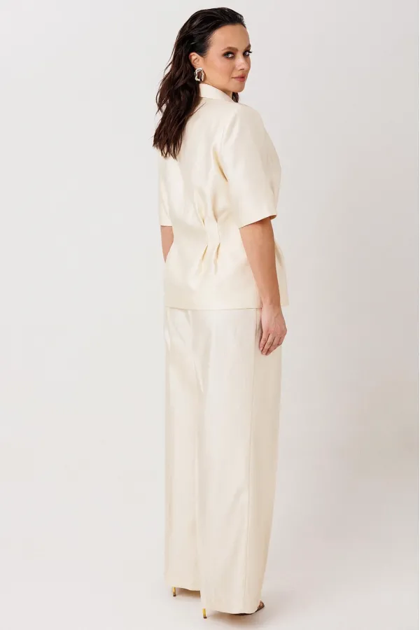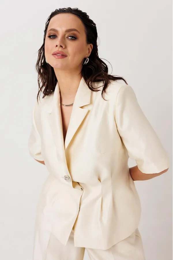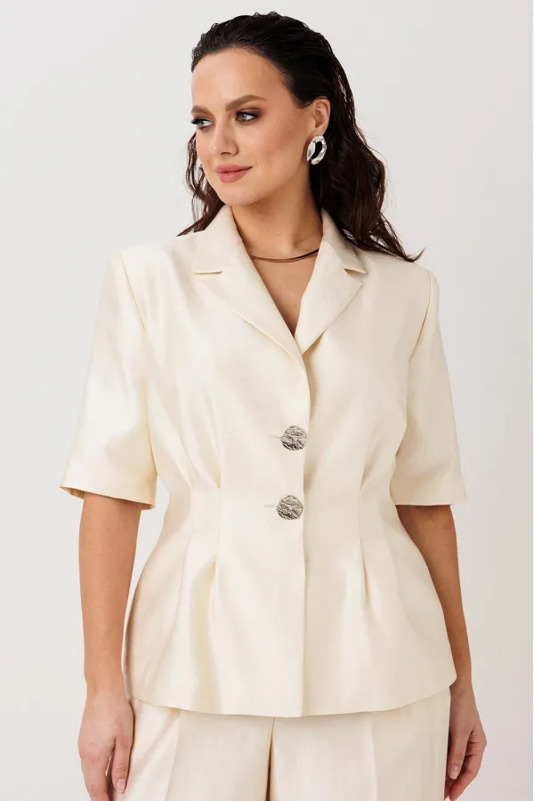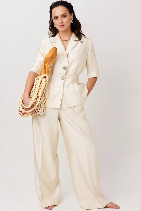Элегантный костюм-двойка (жакет и брюки), выполненный из сатиновой костюмной ткани с легким сиянием, сочетает строгий деловой стиль с современными деталями. Жакет с V-образным вырезом и приталенным силуэтом застегивается на два декоративных пуговицы, формирующих акцент на талии. Короткие рукава с четкой структурной обработкой краев обеспечивают функциональность и лаконичность. Брюки высокой посадкой и прямым кроем создают эффект легкости и изысканности, идеально дополняя силуэт.