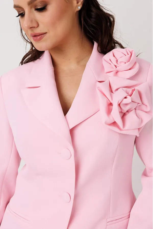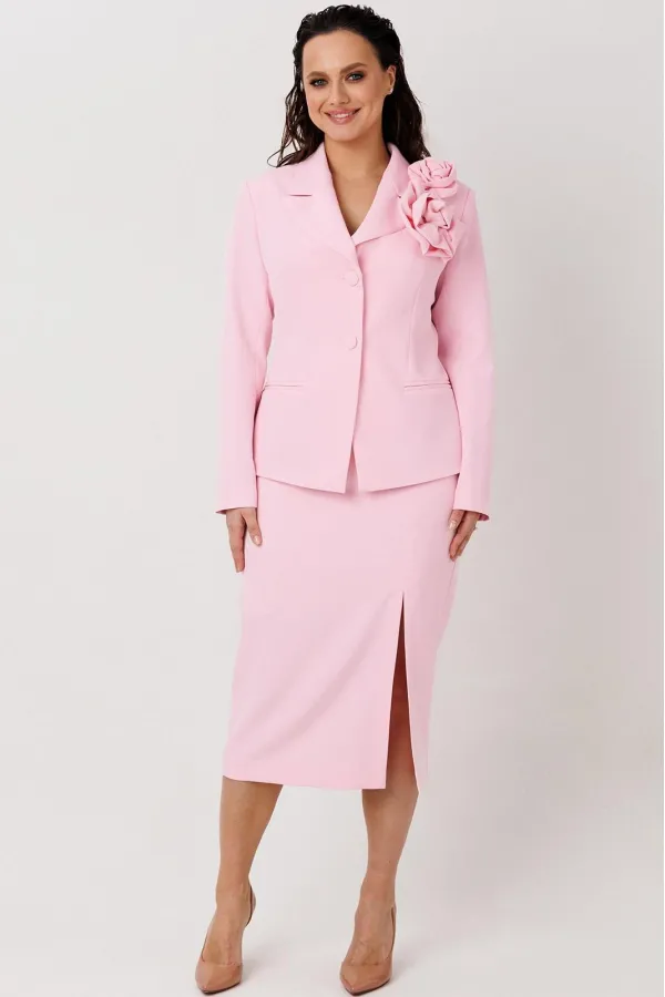 Элегантный женский костюм классического кроя. Комплект состоит из жакета и юбки-карандаш. Жакет полуприлегающего силуэта, спинка со средним швом, заканчивающимся шлицей. По конструкции предусмотрен воротник с лацканами. Застежка на две пуговицы. В передней части предусмотрены два прорезных кармана. Рукава втачные, двухшовные, со шлицей на пуговицах. Юбка длиной миди, слегка зауженная к низу. Застежка на молнию в центральном шве. В левой боковой части юбки размещен разрез от колена до низа, что обеспечивает свободу движения и добавляет элегантности. Жакет и юбка на подкладке. Жакет дополняет декоративная съемная брошь.