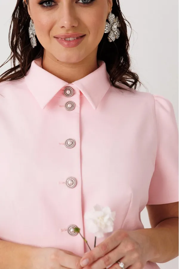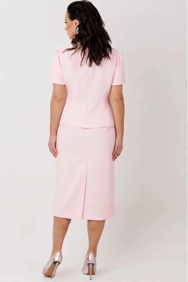 Элегантный женский костюм классического кроя. Комплект состоит из жакета и юбки-карандаш. Жакет полуприлегающего силуэта, спинка со средним швом. По конструкции предусмотрена центральная застежка на 8 пугович. воротник стоячий отложной. Рукава втачные, со сборкой по окату. Юбка длиной миди, слегка зауженная к низу со шлицей. Пояс юбки на обтачке, застежка на тесьму-молнию, пояс частично на резинке по бокам. Жакет и юбка на подкладке.