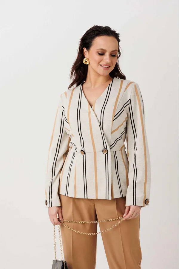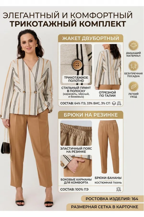 | Ткань | трикотаж+костюмная ткань - жакет: полиэстер 64% вискоза 33% спандекс 3%; брюки: полиэстер 100% |