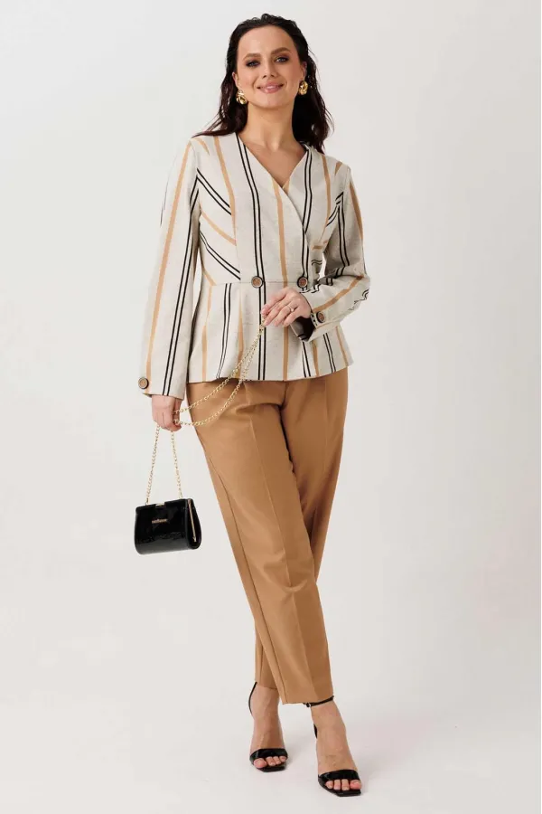 Костюм женский, состоящий из трикотажного жакета без подкладки и брюк. Жакет полуприлегающего силуэта, отрезной по линии талии, с двухбортной застежкой. Перед с рельефами и почками, выкроенными по косой. Спинка с центральным швом, с рельефами и бочками по косой. Рукав втачной, одношовный, внизу со складкой и декоративной пуговицей. Брюки из костюмной ткани, зауженные к низу, на резинке. У брюк пояс на резинке, боковые карманы, имитация гульфика.