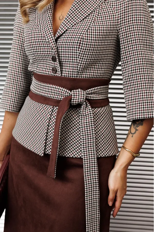 Бестселлер нашей коллекции - двухпредметный костюм, состоящий из жакета и юбки. Акцентом данного комплекта является съемный пояс. Для создания данного образа мы использовали мелкую клетку в тандеме с экокожей.Жакет приле... Читать далее...