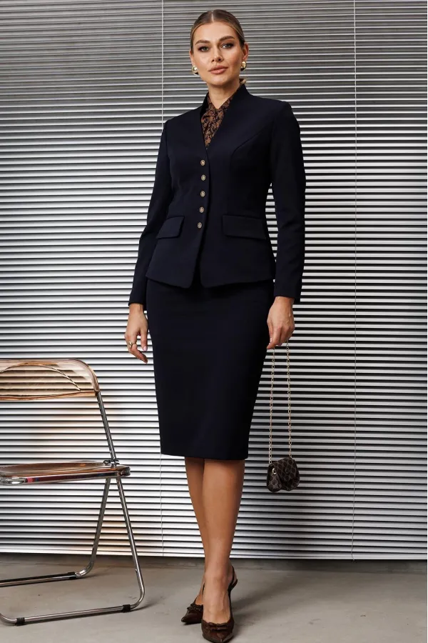 Застежка на тесьму-молнию в среднем шве, который переходит в шлицу. Жакет и юбка на подкладке.