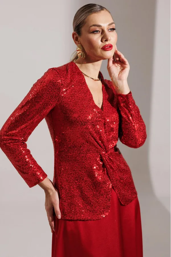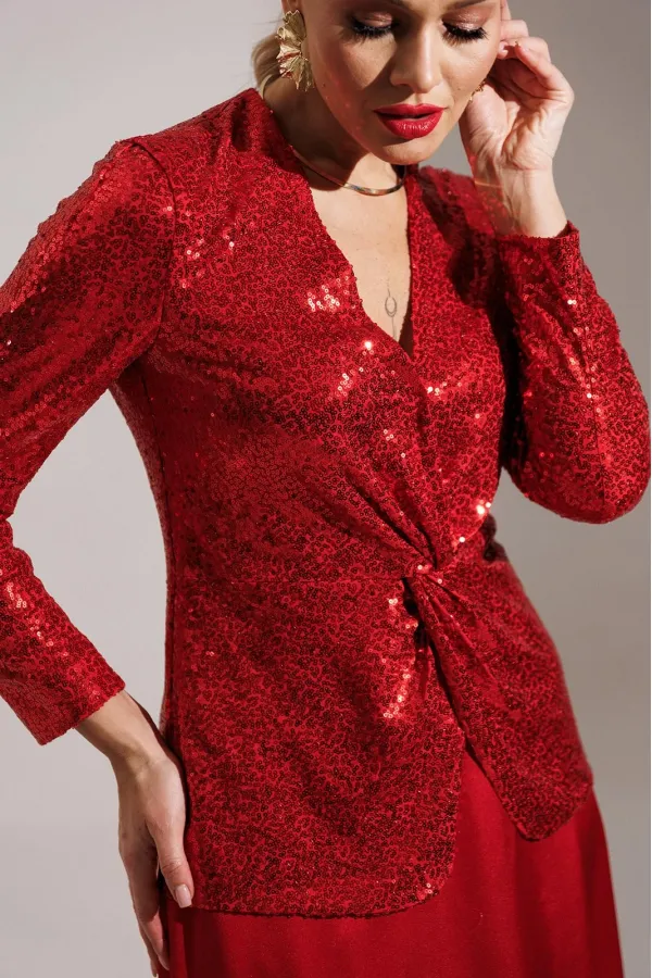 Продолжением нашей нарядной коллекции является роскошный комплект, состоящий из блузы, имитирующей жакет, и невероятной струящейся юбки из атласа длины макси. Блуза из ткани в пайетки с декоративным узлом в области талии. V-образный вырез. Блуза приталенного силуэта с втачными, двухшовными рукавами. Блуза частично на подкладке. Юбка на поясе с резинкой.
