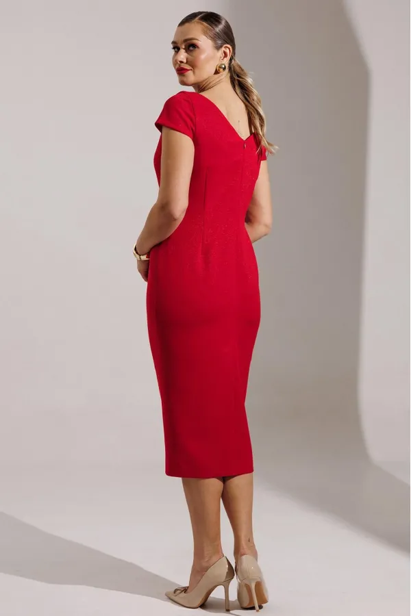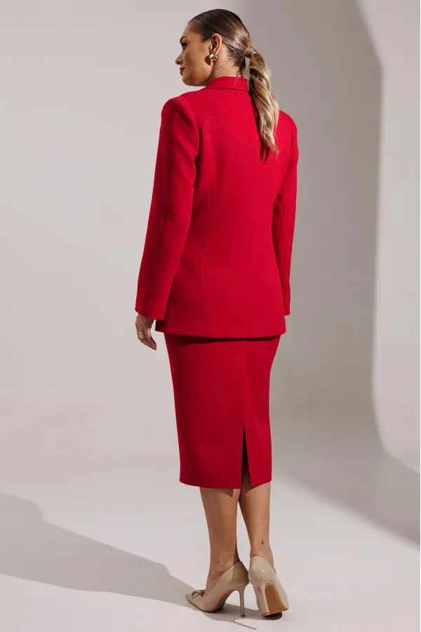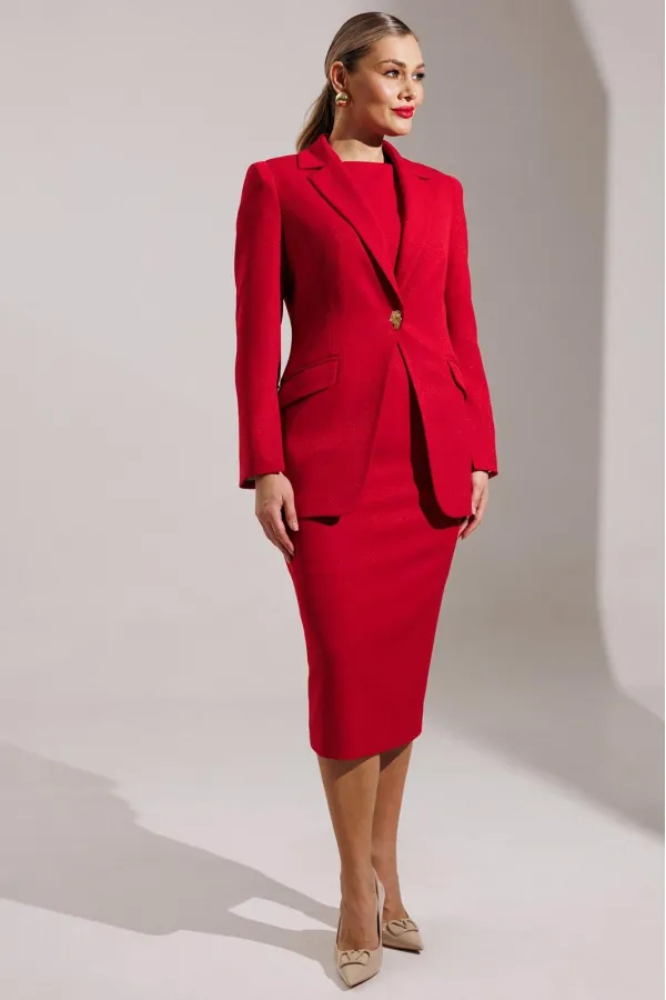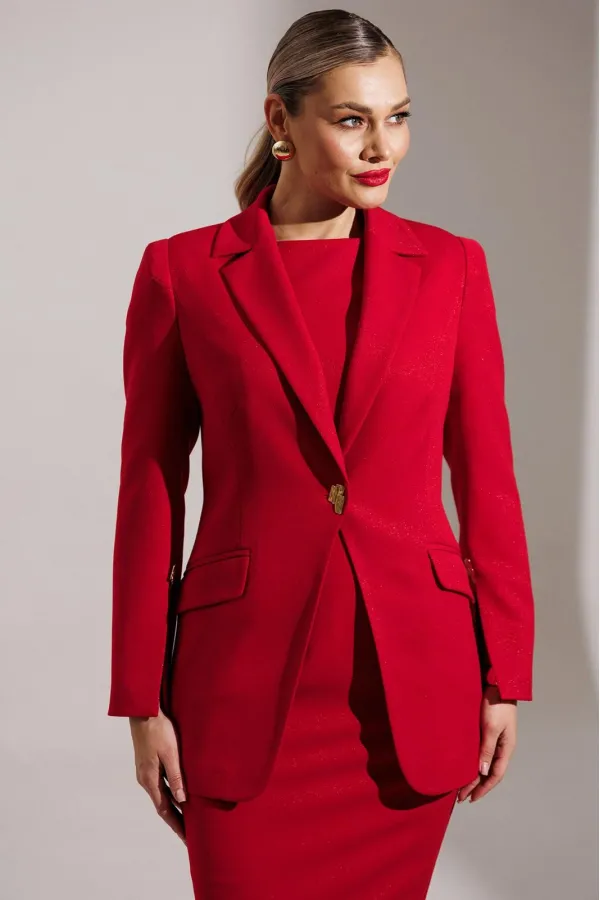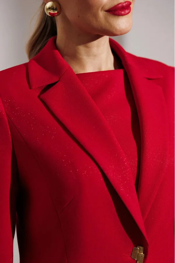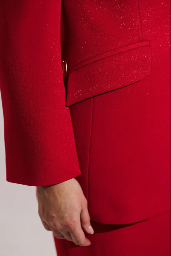 Нарядный комплект, состоящий из жакета и платья. Жакет - воплощение стильной трансформации. Его классический крой выполнен из безупречной трикотажной ткани, но в деталях скрывается своенравный характер. Жакет полуприлегающего силуэта. Модель отличается аккуратным кроем и стильными деталями. На передней части жакета обработаны вертикальные рельефы, идущие от проймы до уровня кармана и от кармана до низа, что придаёт силуэту выразительность и стройность. Воротник пиджачного типа добавляет классической элегантности. Застёжка центральная бортовая на петлю-пуговицу. Карманы в рамке с клапанами, гармонично расположены на передней части жакета. Спинка с центральным швом и вертикальными рельефами, идущими от проймы. Рукава двухшовные с отрезной деталью по окату и разрезами внизу добавляют свободы движению и делают модель более интересной. Жакет на подкладке. Платье женское приталенное из трикотажного полотна, длиной ниже колена. Рукава короткие - «крылышки». Вырез горловины спереди «лодочкой», сзади - V-образный. Платье приталено вытачками. В среднем шве спинки обработана шлица и потайная молния. Платье на подкладке.