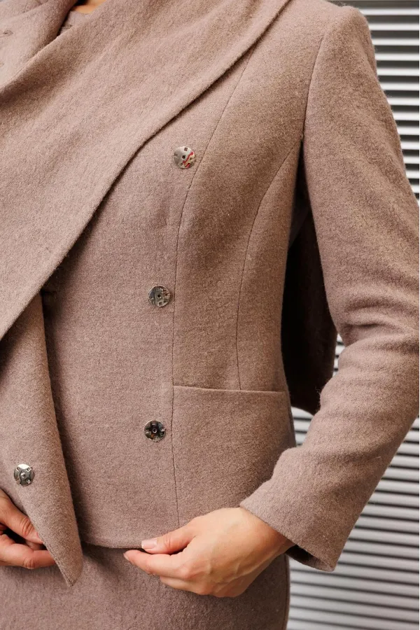 Комплект женский, состоящий из жакета и юбки. Жакет полуприлегающего силуэта с рельефами по переду и спинке. Полочка с карманами от рельефа до бокового шва. Застежка на кнопки и в верхней части на петли-пуговицы. В жакете оригинально оформлена линия горловины - в виде драпирующегося шарфа, что позволяет использовать его в прохладную погоду в качестве верхней одежды. Юбка прямая, зауженная к низу, сверху на притачном поясе с резинками. Застежка на тесьму-молнию в среднем шве, которая переходит в шлицу. Костюм на подкладке.