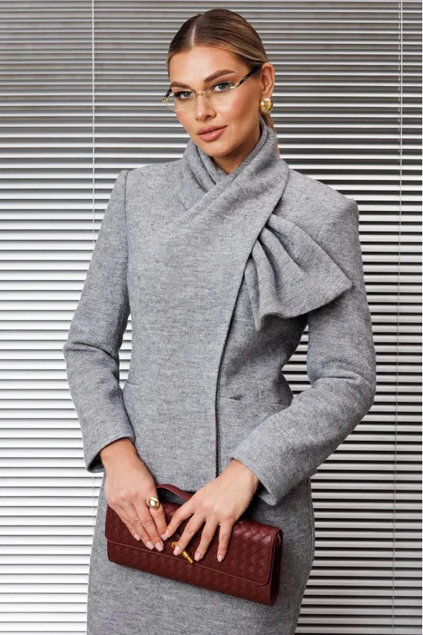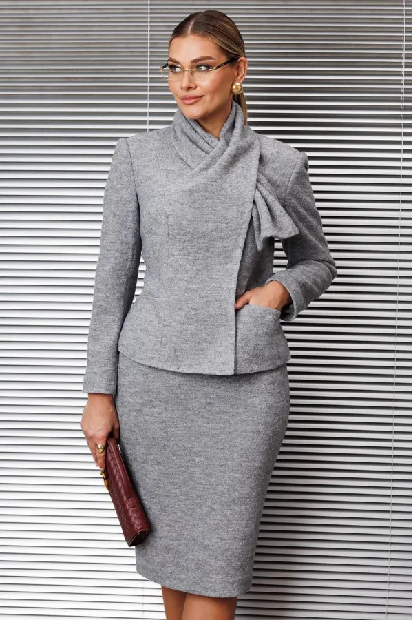 Комплект женский, состоящий из жакета и юбки. Жакет полуприлегающего силуэта с рельефами по переду и спинке. Полочка с карманами от рельефа до бокового шва. Застежка на кнопки и в верхней части на петли-пуговицы. В жакете оригинально оформлена линия горловины - в виде драпирующегося шарфа, что позволяет использовать его в прохладную погоду в качестве верхней одежды. Юбка прямая, зауженная к низу, сверху на притачном поясе с резинками. Застежка на тесьму-молнию в среднем шве, которая переходит в шлицу. Костюм на подкладке.