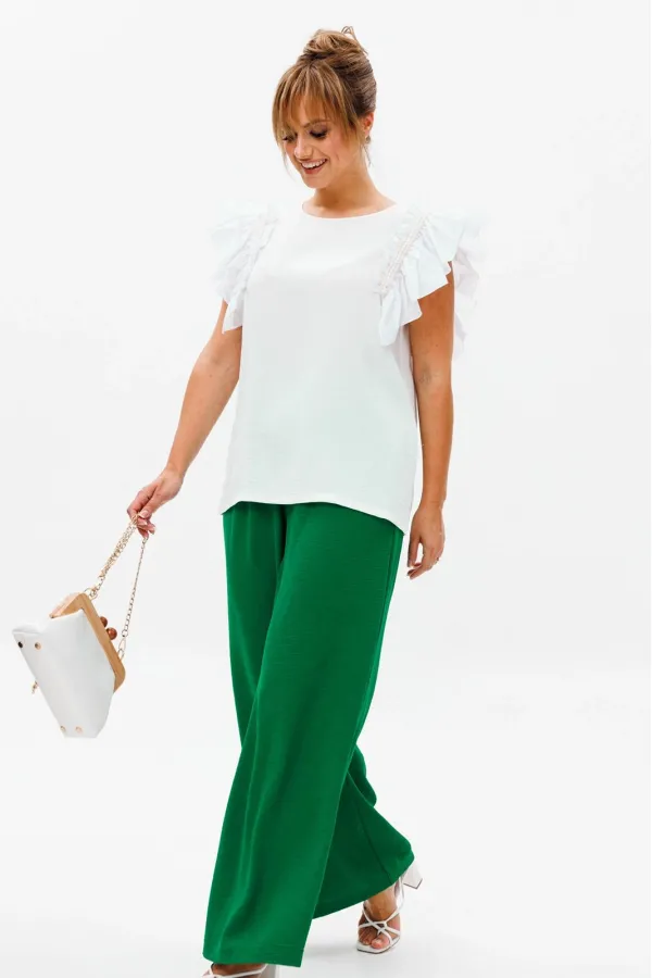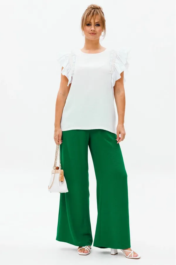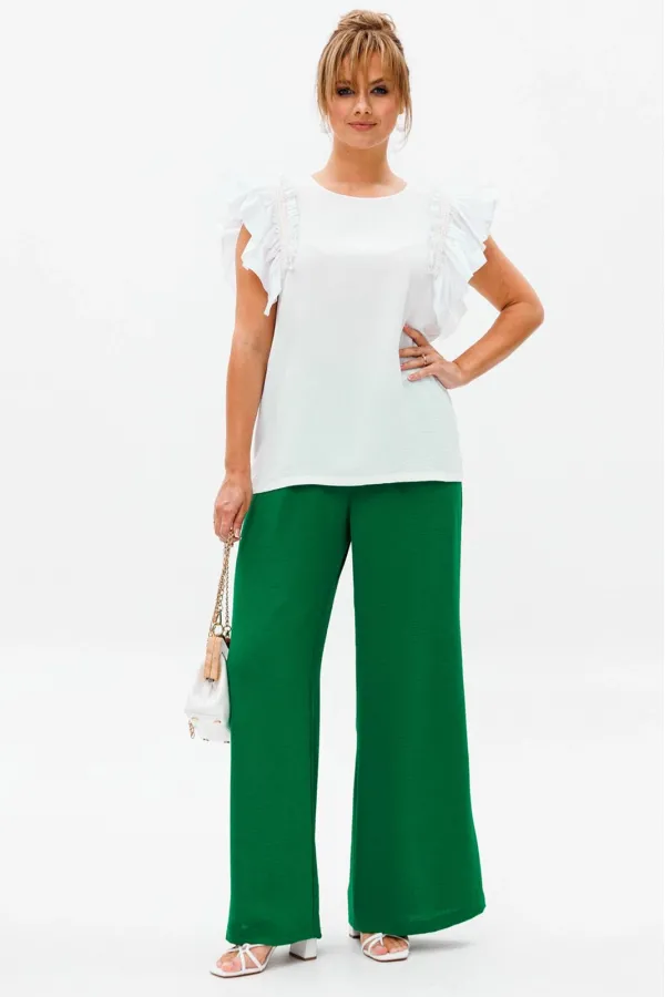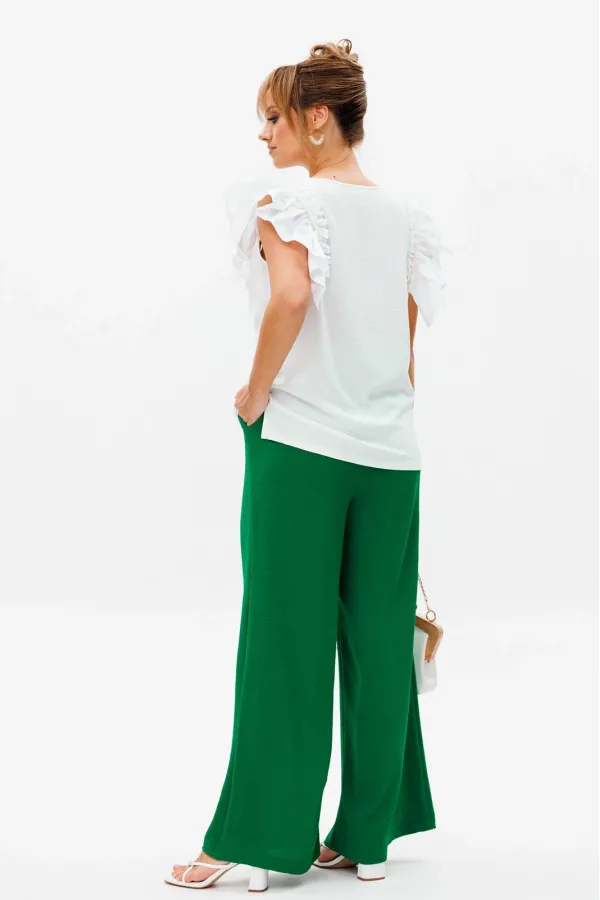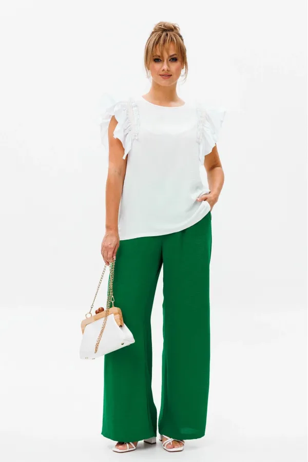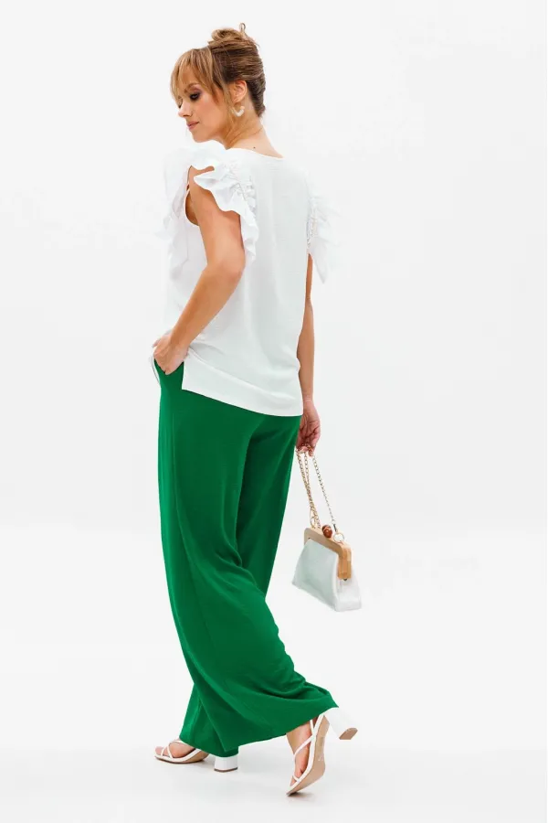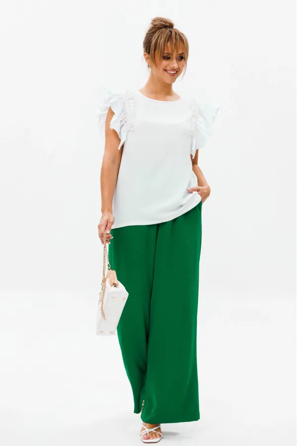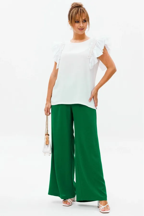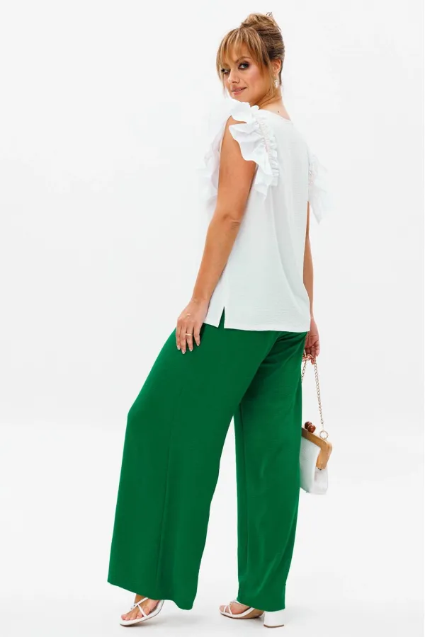 Летний женский костюм, состоящий из брюк и нарядной блузы, выполненный из костюмно-блузочной ткани (тянется).