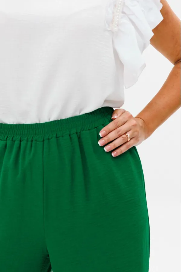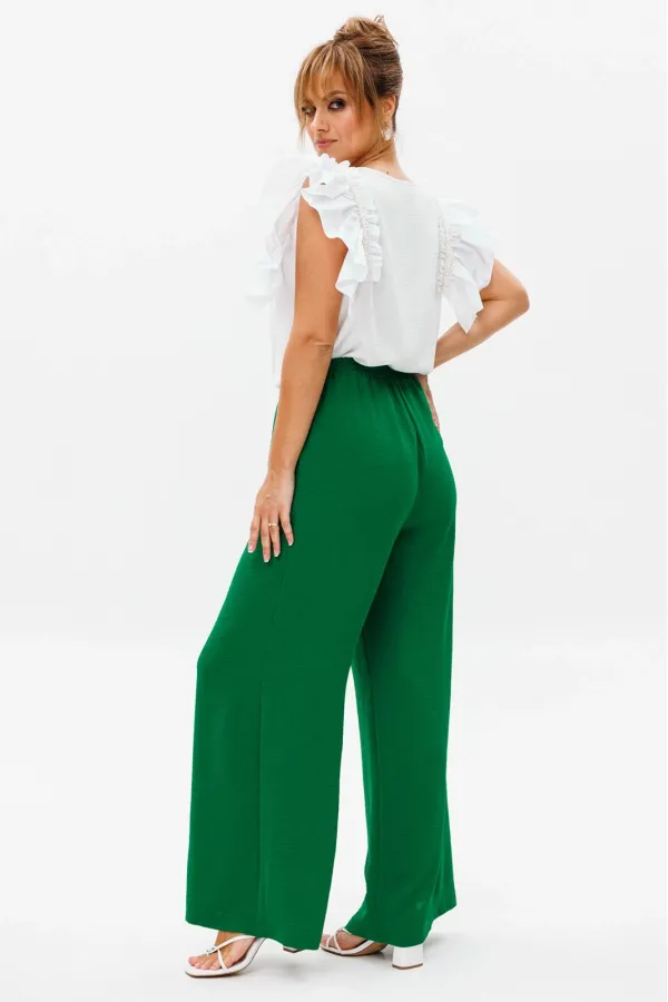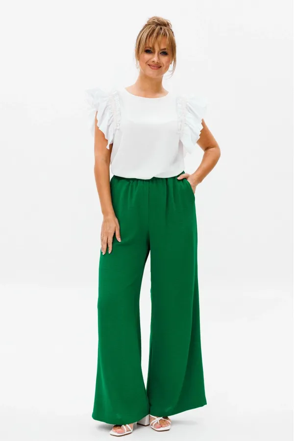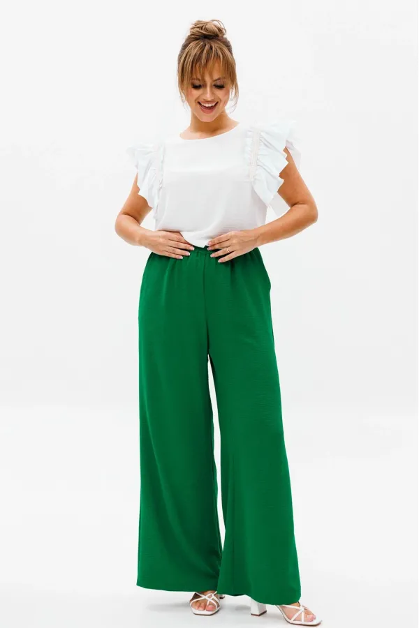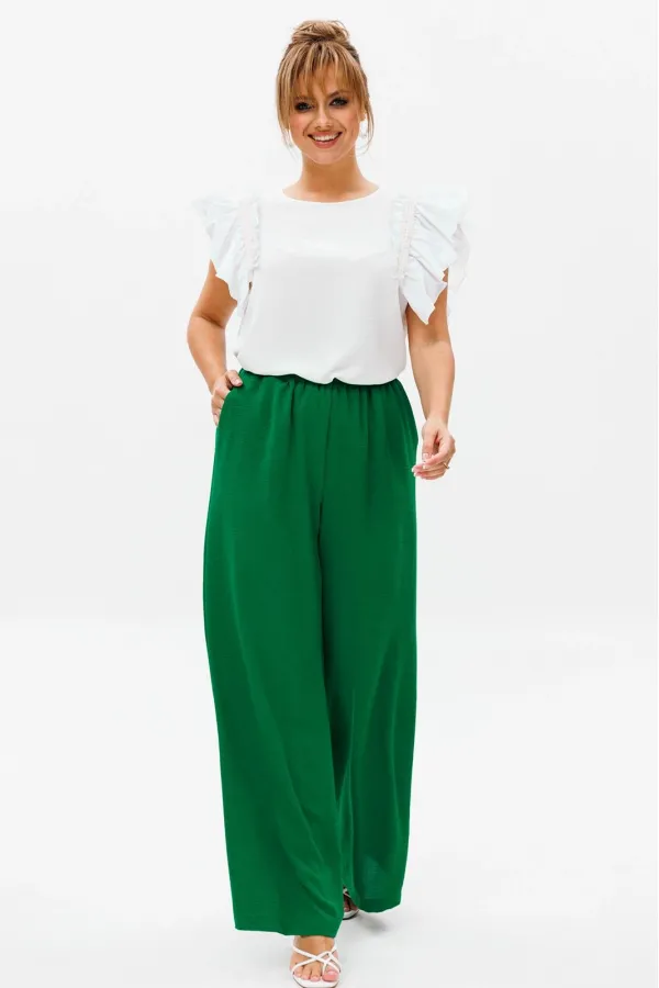Брюки прямого свободного кроя с высокой посадкой. В боковых швах наклонные карманы. Верхний срез оформлен поясом с эластичной резинкой.