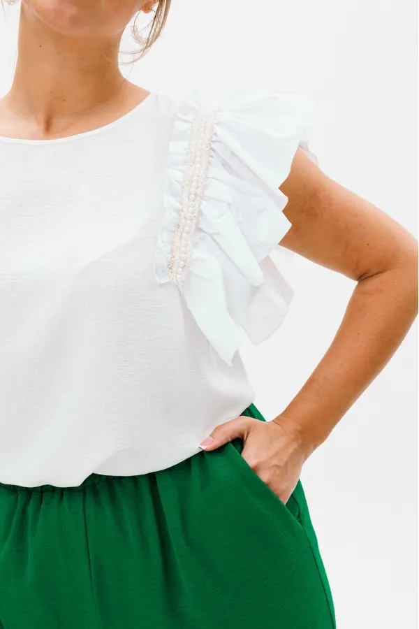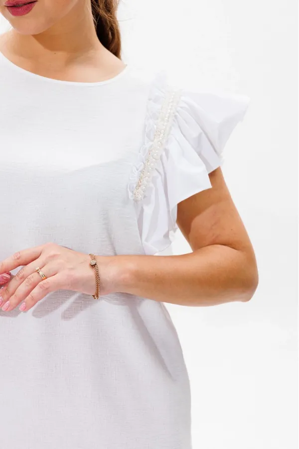 Блуза прямого силуэта с разрезами по бокам. Горловина округлой формы, обработанная окантовкой. Рукава в блузе в виде рюши из тафты, которые декорированы тесьмой с бусинами.