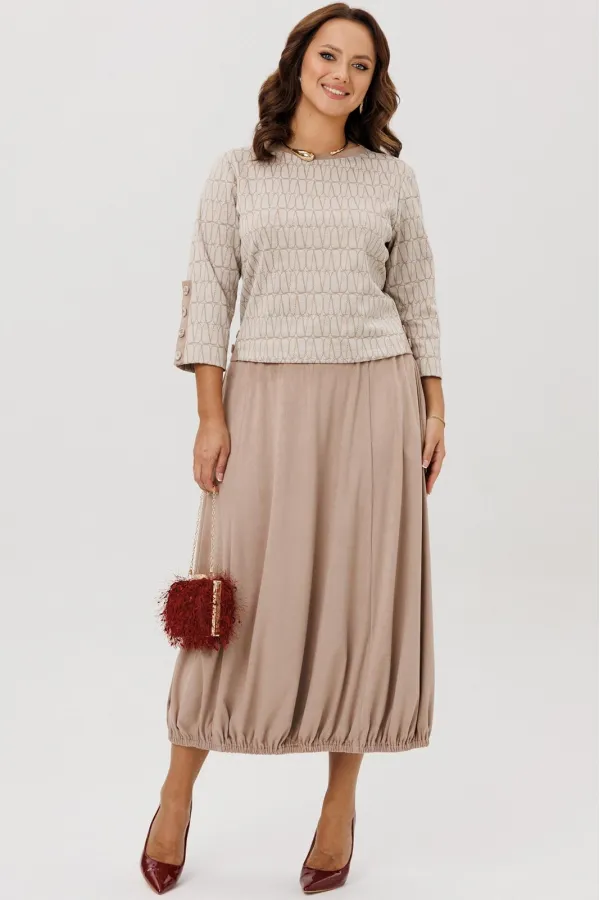 Юбка-баллон без подкладки, выполнена из костюмно-плательной ткани «Замша» (тянется). По переднему и заднему полотнищу вертикальные швы. В боковых швах функциональные карманы. Верхний срез оформлен поясом с эластичной резинкой. Нижний срез – собран резинкой.