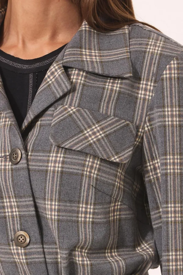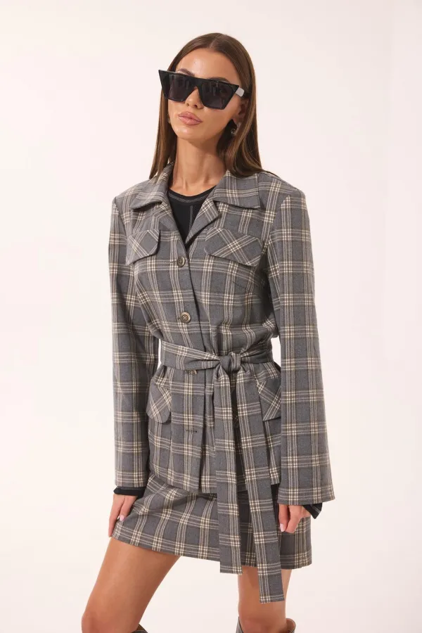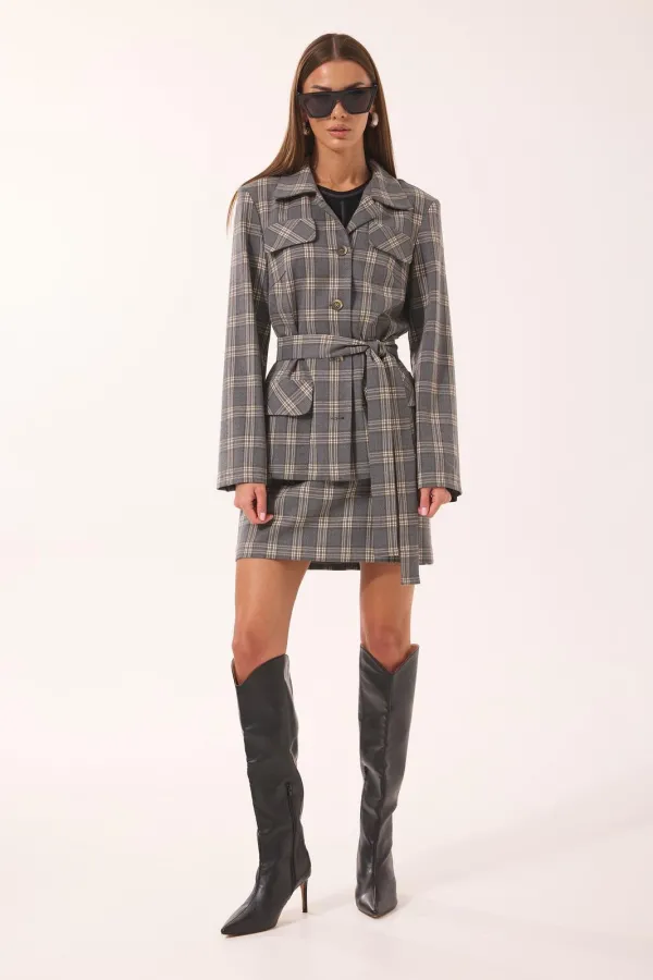 Комплект женский двухпредметный, состоящий из жакета и юбки, выполнен из ткани в клетку.
