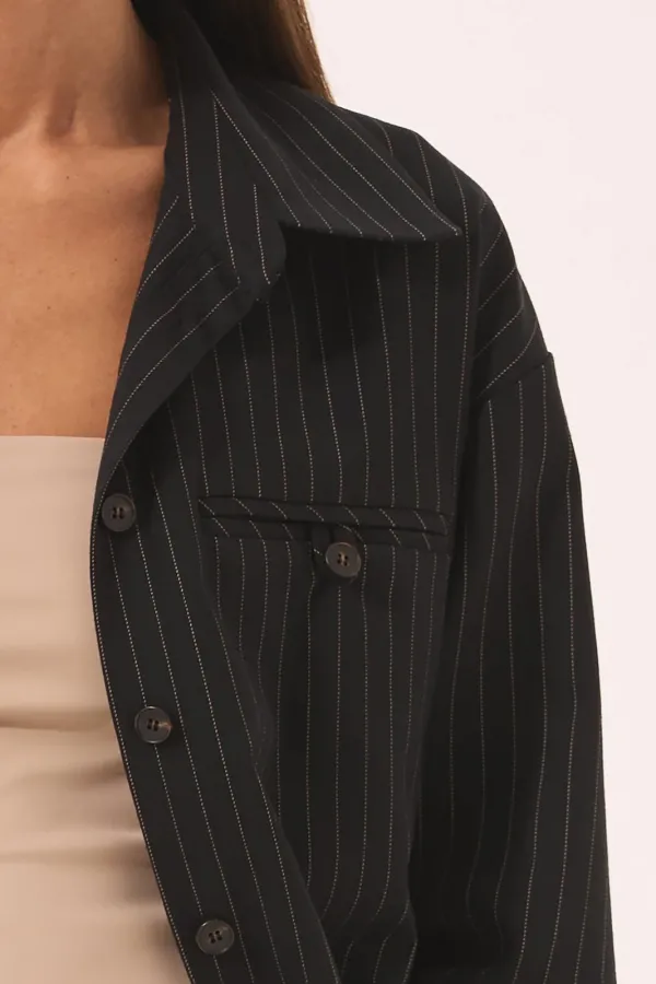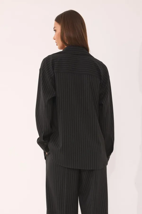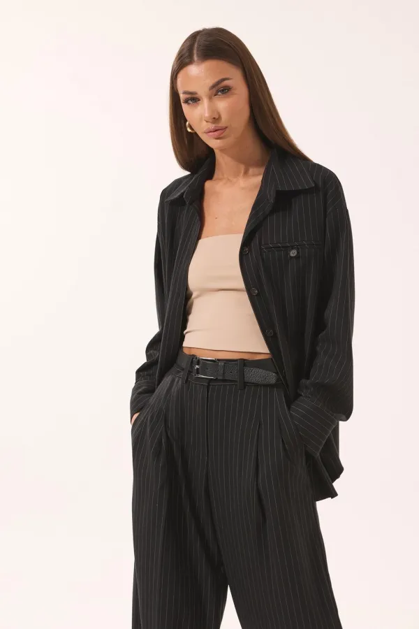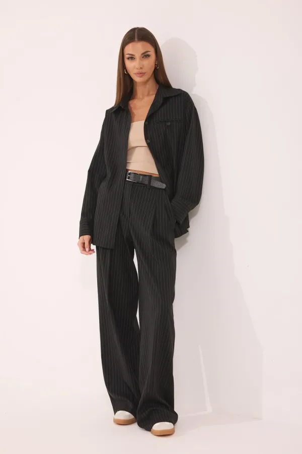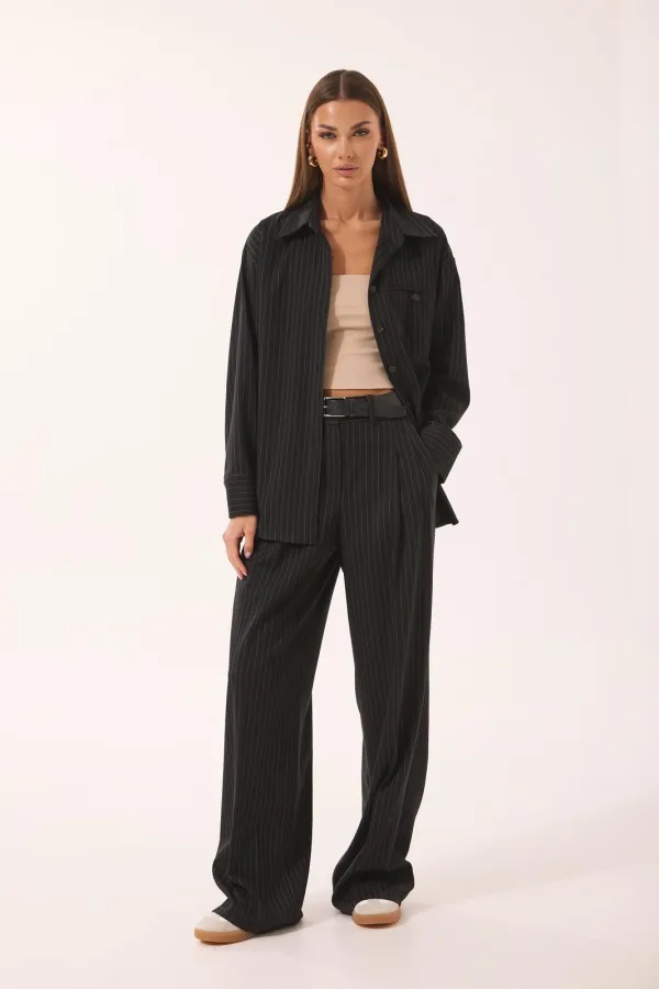 Костюм женский, состоящий из блузы и брюк, выполнен из ткани в полоску.