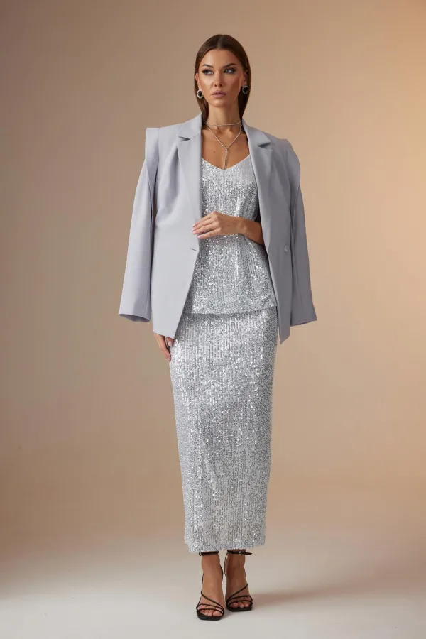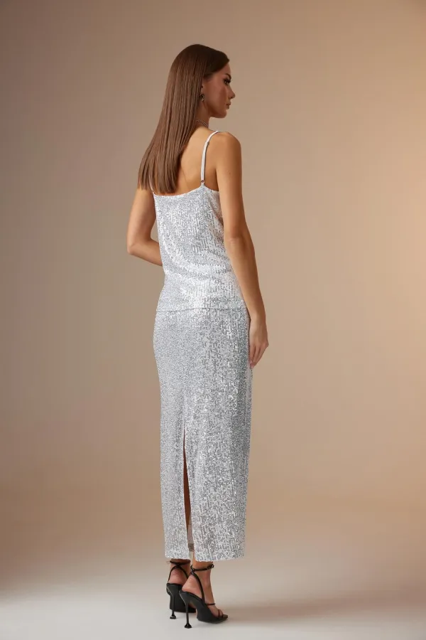 Топ: полуприлегающего силуэта на бретелях, выполнен из отделочной трикотажной ткани, с «пайетками», на трикотажной подкладке. Вырез горловины «V»-образный, с регулируемыми бретелями по длине.