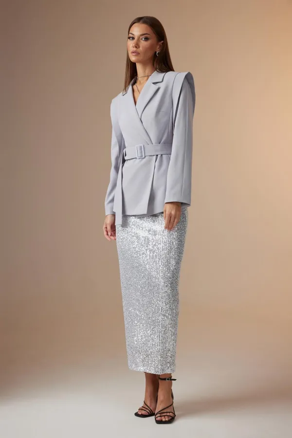 Юбка: длинная, зауженная к низу, с цельнокроенным поясом на резинке. Выполнена из трикотажного полотна с «пайтками». Заднее полотнище юбки со средним швом, в котором расположен разрез выше уровня колена. Изделие на трикотажной подкладке.