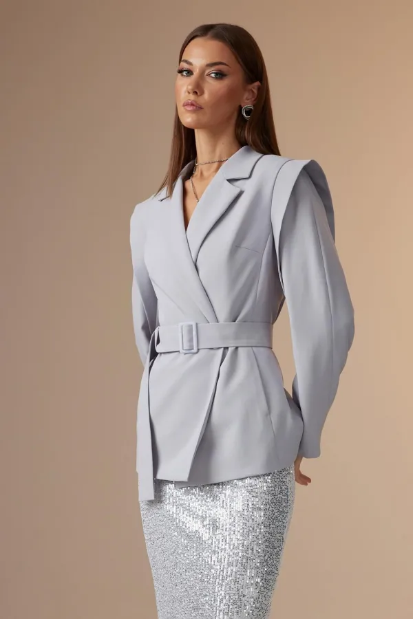 Жакет: полуприлегающего силуэта с двухбортной застежкой на одну пуговицу. Воротник пиджачного типа. Рукав длинный, трехшовный – дополнительный шов по центру верхней половинки для создания объема рукава, так же в швы верхних половин рукава вставлено крылышко для расширения линии плеча. По переду отрезной бочок, от него нагрудная вытачка и карманы в шве. Спинка со средним швом, отрезным бочком и талиевыми вытачками.