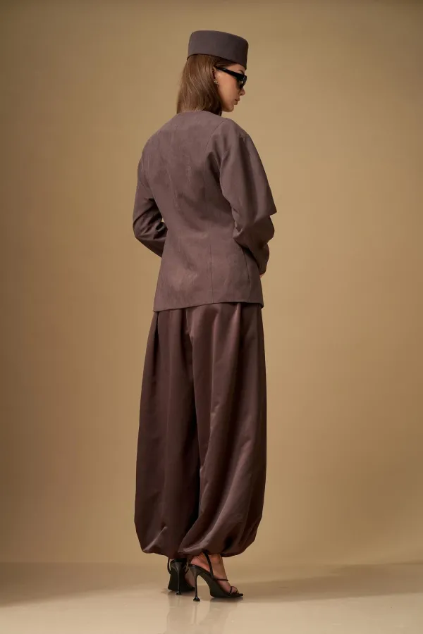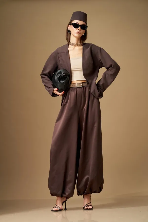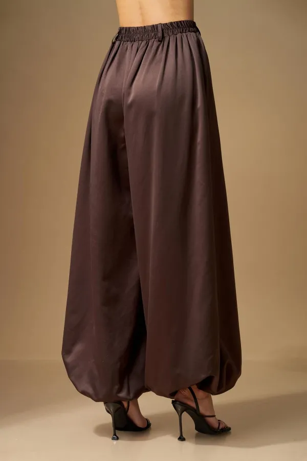 Брюки свободной формы, с низкой посадкой, сильно расширенные и собранные снизу на резинку. Верхний срез обработан поясом на резинке, центральная часть переда без резинки. Брюки по силуэту называются «алладины».