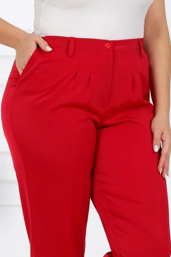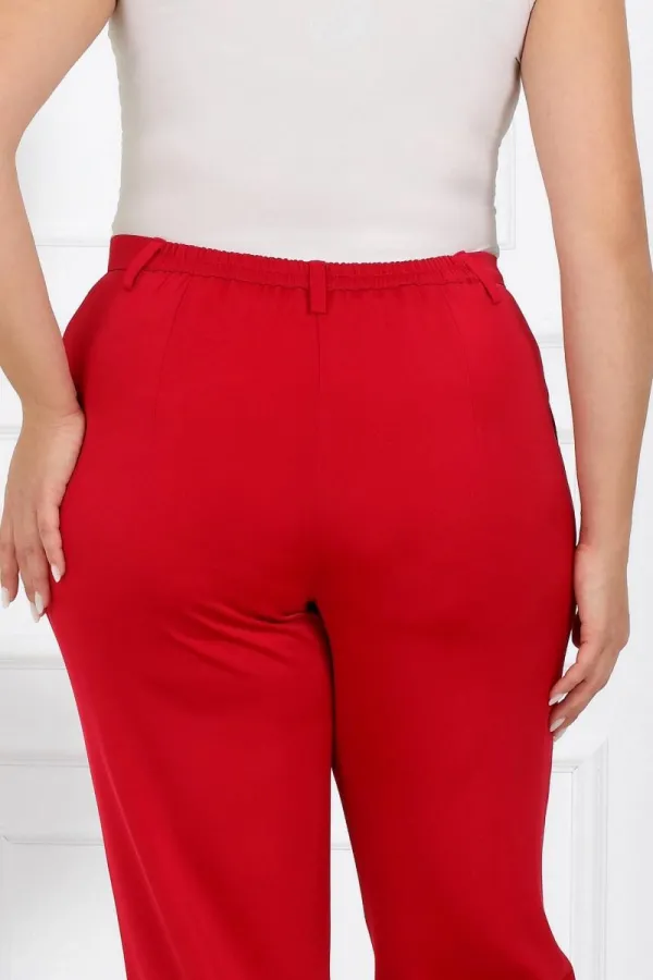 Брюки классические длинные, прямого силуэта, с посадкой на талии, выполнены из костюмно-плательного сатина. Модель с центральной застёжкой на тесьму-«молнию», на притачном поясе со шлевками, застегивающемся на петлю и пуговицу. Передние половинки брюк с двумя, застроченными от пояса вниз, односторонними складками, с боковыми наклонными карманами. Задние половинки брюк с талиевыми вытачками, направленными от пояса вниз. Для лучшего прилегания брюк в области талии в поясе по задним половинкам вставлена эластичная лента. Длина брюк по боковому (с поясом) 100,5 см (46-48 р-р); 101,5 см (50-52 р-р); 102,5 см (54-56 р-р); 104,0 см (58-62 р-р).