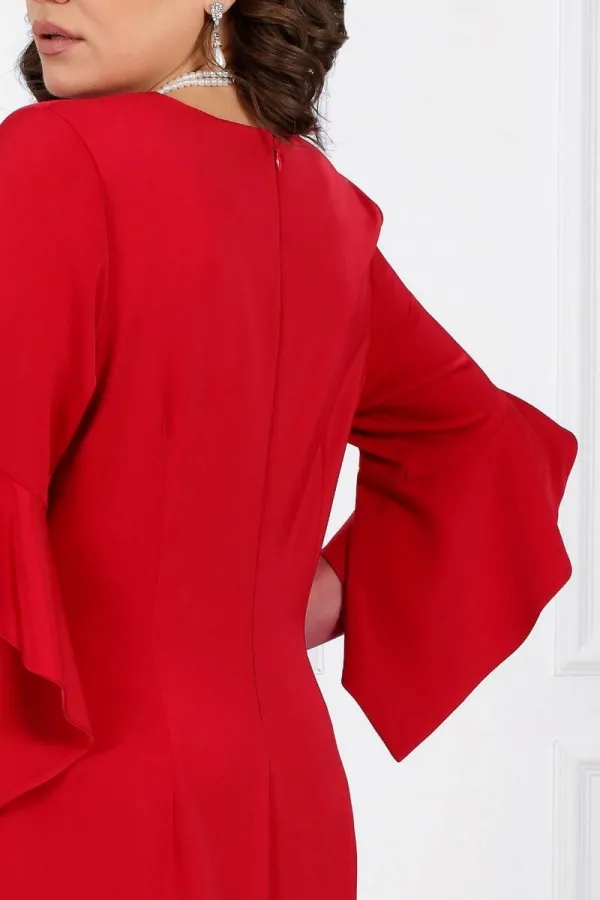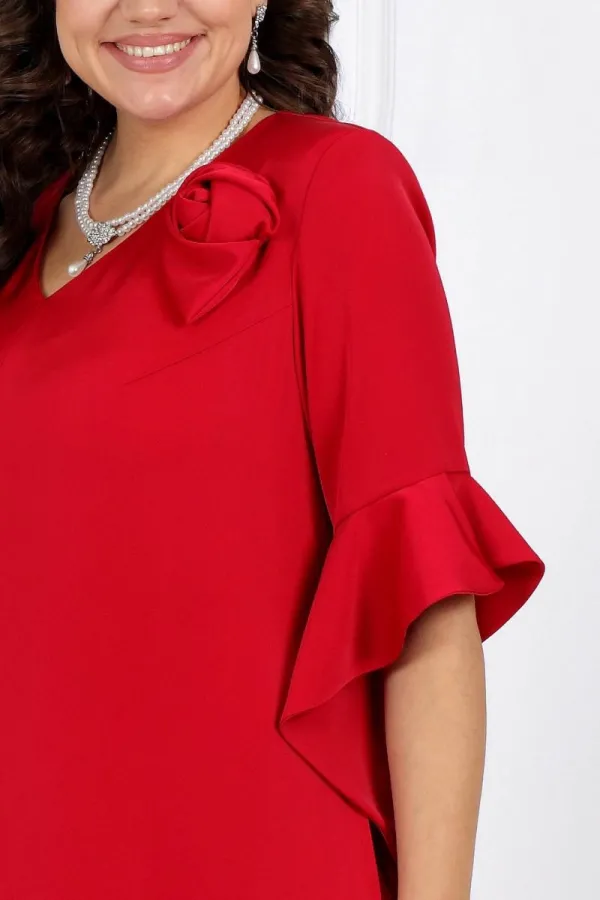 Туника полуприлегающего силуэта, выполнена из костюмно-плательного сатина. Модель без подкладки, с плечевыми накладками. Перед с нагрудными вытачками, направленными от пройм, и средним швом, в нижней части которого обработан разрез. Спинка с талиевыми вытачками и средним швом, в верхней части которого расположена застежка на потайную тесьму-«молнию», в нижней части-разрез. Ширина отделочной строчки по центральным разрезам переда и спинки – 4 см. В боковых швах высокие разрезы расположены от уровня талии до низа. Ширина отделочной строчки по боковым разрезам – 1 см. V-образный вырез горловины переда переходит в округлый по спинке. Рукав втачной, с асимметричным обтачным воланом по низу. Туника дополняется съемным декоративным цветком «роза», выполненным из основной ткани. Длина туники – 133,5 см (46-52 р-р), 135 см (54-62 р-р).